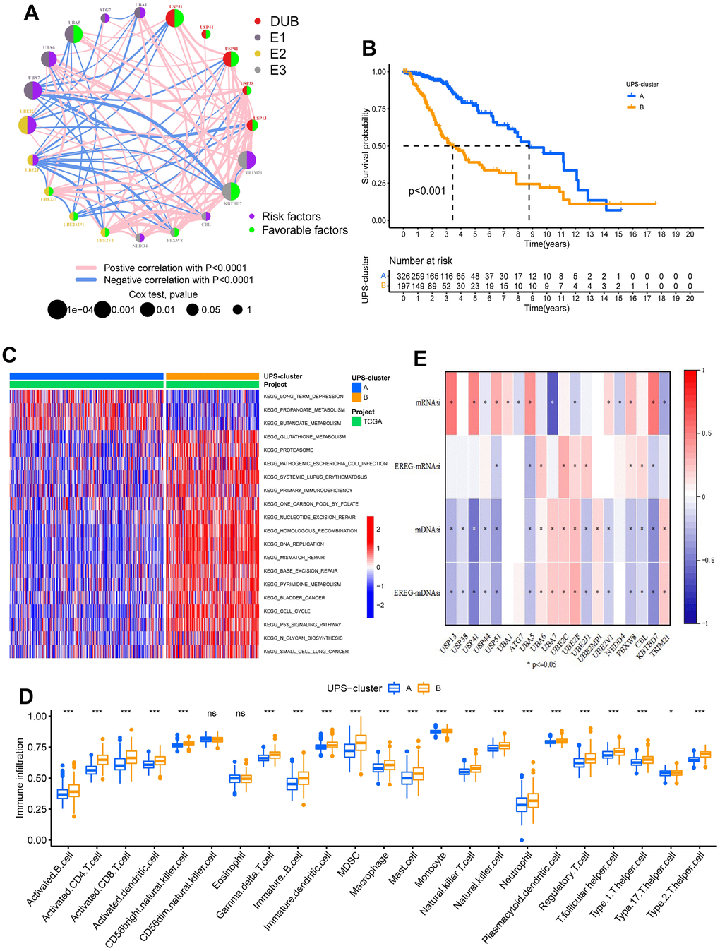 Univariate Cox analysis confirmed the prognostic values of 20 ubiquitination regulators in low-grade glioma patients (Supplementary Figure 2A). The comprehensive landscape of ubiquitination regulator interactions and regulator relations, as well as the prognostic meaning for LGG patients, was illustrated with the ubiquitination regulator network (Figure 2A). To investigate the correlation among the regulators, we estimated pairwise connections between the expression of 20 ubiquitination regulators in LGG and discovered that positive associations outnumbered negative correlations (Supplementary Figure 2B). We discovered that not only the ubiquitination regulators in the homo-functional class exhibited a remarkable connection in expression, but there was also a strong relation between E1, E2, E3, and UDBs. Notably, we also observed that all ubiquitination regulators were significantly linked to immune cell infiltration and biological processes related to the regulation of the tumor microenvironment (Supplementary Figure 2C, 2D). Thus, cross-talk among the regulators of E1, E2, and E3 and UDBs could be crucial for the generation of distinct ubiquitination modification patterns and immune characteristics among LGG patients.