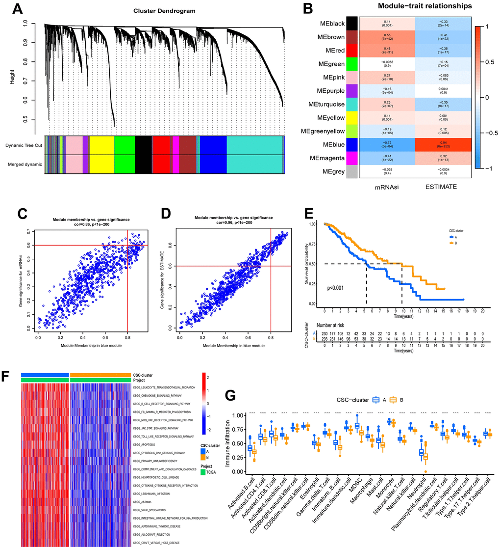 To explore the underlying biological behavior of the ubiquitination modification modes, we performed an unsupervised consensus clustering analysis of these 18 overlapped genes and further classified the samples into the corresponding cancer stem cell subtypes. As with the clustering results of the ubiquitination modification pattern, LGG patients were clustered into 2 distinct stem cell phenotypes (Supplementary Figure 5C–5E). Patients with CSC-cluster B had a better prognosis than patients with CSC-cluster A (Figure 3E). The expression patterns of ubiquitination modification regulators were significantly different in these two stem cell clusters, which again suggest that the two ubiquitination modification patterns have different effects on the tumor stem cell phenotype (Supplementary Figure 5F). The GSVA enrichment analysis showed immune-related biological processes such as leukocyte transendothelial migration, chemokine signaling pathways, B cell receptor signaling pathways, and cytokine-cytokine receptor interaction were significantly upregulated in the CSC-cluster A group (Figure 3F). Moreover, the CSC-cluster A group exhibited prominent enrichment of immune pathways (CD8 T effector, immune checkpoint, and antigen processing pathways) (Supplementary Figure 5G), as well as massive infiltration of immune cells (both pro- and anti-tumor immune cells) (Figure 3G), confirming again the intersectionality of ubiquitination modification regulating cancer stemness and immunity. The CSC-cluster B showed the opposite pattern (relatively few immune cells and weak enrichment of immune pathways). Importantly, the stromal-related pathways such as EMT and pan-fibroblast TGF response signaling pathways were also significantly enhanced in the CSC-cluster A, which can prevent the immune cell from infiltrating into the tumor core, resulting in a worse prognosis for the CSC-cluster A group.