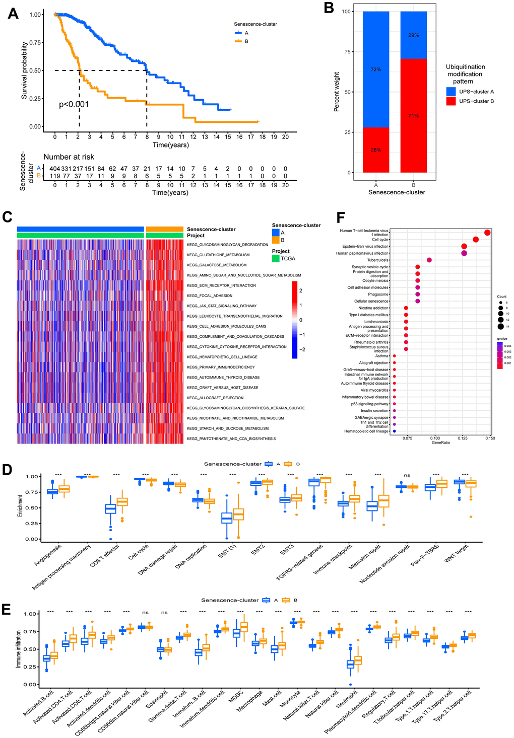 The GSVA enrichment analysis showed that the immune-related biological processes such as leukocyte transendothelial migration and cytokine-cytokine receptor interaction and stromal-related pathways like ECM receptor interactions were significantly upregulated in the Senescence-cluster B group, whereas they were relatively decreased in Senescence-cluster A (Figure 4C). We further identified differences in the enrichment of stromal-related biological processes among the cellular senescence phenotypes. Stromal-related biological processes such as angiogenesis, EMT, and Pan−F−TBRS were markedly increased in the senescence-cluster B group compared to the senescence-cluster A group. Moreover, the Senescence-cluster B group exhibited prominent enrichment of immune pathways (CD8 T effector, immune checkpoint, and antigen processing pathways) as well as abundant infiltration of immune cells (both pro- and anti-tumor immune cells), confirming the intersectionality of ubiquitination modification regulating cellular senescence and immunity (Figure 4D, 4E). The Senescence-cluster A displayed the inverse trend (relatively few immune cells and weak enrichment of immune pathways).