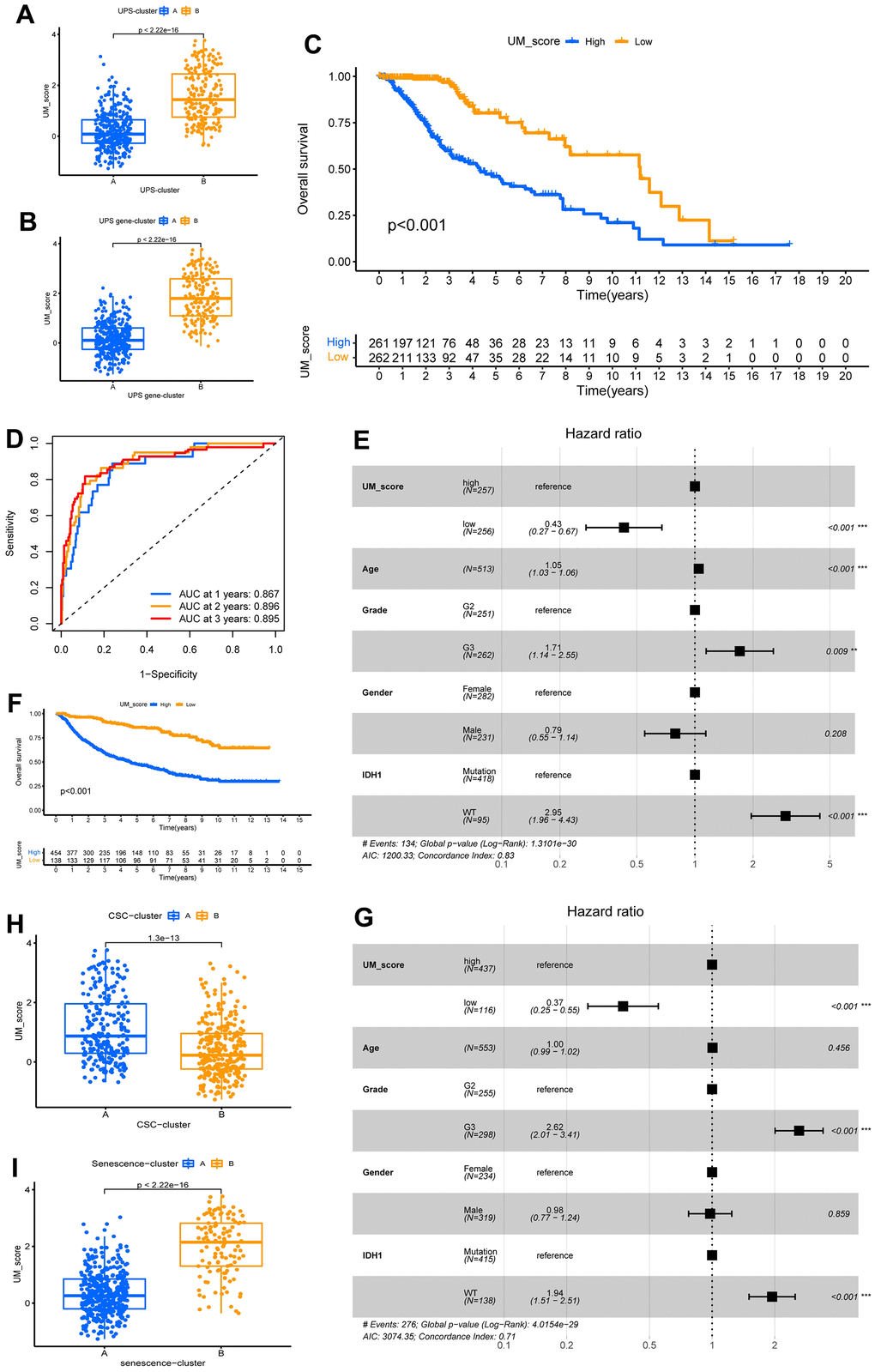 The AUCs of the ROC analysis for the UM-score were 0.867, 0.896, and 0.895 at 1, 2, and 3 years of OS, respectively (Figure 5D). We used the multivariate Cox method with patient clinical features such as age, gender, grade, and the IDH1 mutation to see if the UM score could serve as an independent prognostic factor. We discovered that the UM-score was a reliable and independent prognostic biomarker for assessing patient outcomes (Figure 5E; HR =0.43, 95% CI 0.27–0.67, p<0.001). The dependability of the UM-score was validated utilizing 553 CGGA-LGG patients. Aligned with above results, the low-UM-score group had a better prognosis than the high-UM-score group (Figure 5F) and multivariate Cox method also affirmed that the UM-score could be used as an independent prognosis factor (Figure 5G; HR = 0.37, 95% CI 0.25–0.55, p<0.001). These findings suggest that the UM-score can assess the ubiquitination modification modes and forecast the prognosis of LGG patients.
