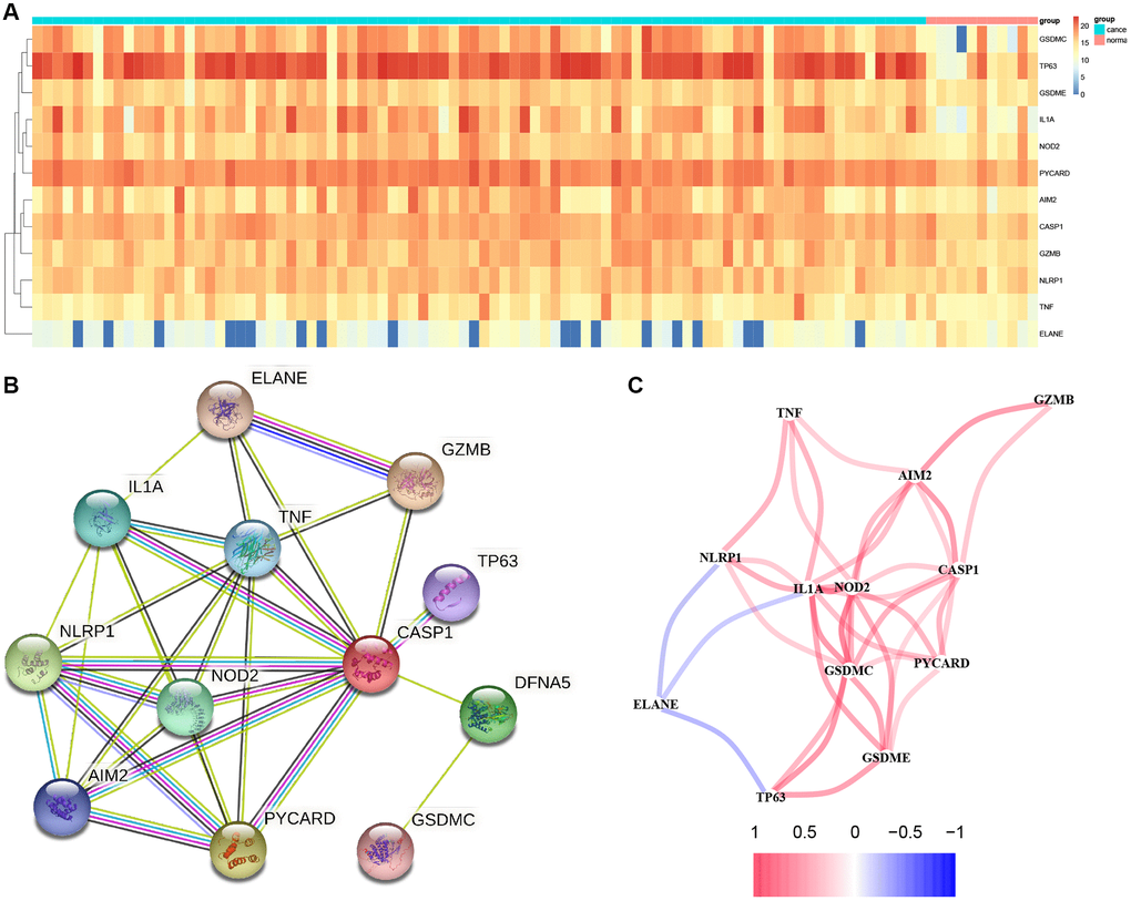 In total, 12 PRGs were selected through TCGA database analysis (Figure 1A). There were several of these genes upregulated in tumors compared to healthy samples, including Gasdermin C (GSDMC), Tumor Protein P63 (TP63), Nucleotide Binding Oligomerization Domain Containing 2 (NOD2), GSDME, Interleukin 1 Alpha (IL1A), PYD And CARD Domain Containing (PYCARD), Absent in Melanoma 2 (AIM2), Caspase 1 (CASP1), Granzyme B (GZMB), Tumor Necrosis Factor (TNF) and NLR Family Pyrin Domain Containing 1 (NLRP1), whereas Elastase, Neutrophil Expressed (ELANE) were downregulated. Using STRING database, we constructed a PPI network that CASP1, TNF, IL1A, NLRP1, AIM2 NOD2, and PYCARD as critical genes interacting with additional genes (Figure 1B). Figure 1C demonstrates a correlation network that contains 12 PRGs.