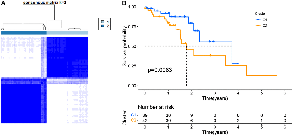 This work conducted consensus clustering analysis for analyzing the relations of 12 PRGs with ESCC subtypes based on TCGA-derived cases, and cases with < 30-day follow-up time were eliminated. With an increase in the clustering variable (k = 2–10), there were the greatest and smallest intragroup and intergroup connections, respectively, found at k = 2, which indicated that ESCC cases were classified as two clusters based on 12 DEGs (Figure 2A). Moreover, we compared the overall survival (OS) of both clusters, which exhibited significant differences (Figure 2B).