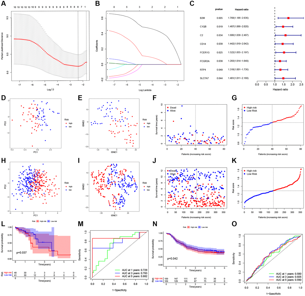 For the present study, we used LASSO Cox regression to develop a risk model based on those eight PRGs (Figure 3A, 3B), and calculated risk scores for each case as follows, risk score = β1 × ExpmRNA1 + β2 × ExpmRNA2 + … + βn × ExpmRNAn. Furthermore, this work conducted univariate Cox regression by incorporating those chosen DEPRGs based on 275 ESCC cases. At p = 0.2, there eight genes were discovered (Figure 3C). By using principal component analysis (PCA) and T-Distribution Stochastic Neighbour Embedding (tSNE), TCGA and GEO cases with diverse risks were grouped into 2 clusters (Figure 3D, 3E, 3H, 3I). With the increase in risk score value, the mortality risk elevated accordingly, while survival time was shortened (Figure 3F, 3G, 3J, 3K). Moreover, based on our validation dataset, our constructed PRGs-based risk model performed well in predicting the patient prognosis (Figure 3L, 3N). In TCGA, the AUC values of 1-, 3-, and 5-year ROC curves were 0.729, 0.783, 0.882, respectively (Figure 3M), whereas those in GEO were 0.580, 0.605, 0.590, respectively (Figure 3O).