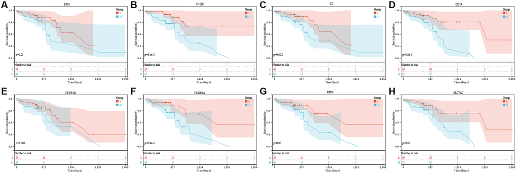 For constructing the prognosis gene model, this work used univariate Cox regression to select prognostic PRGs. Consequently, we detected eight prognostic PRGs altogether. Figure 4 represents K-M survival curves, indicating the dismal survival of ESCC. Cases showing upregulation of B2M (Figure 4A, P = 0.01), C1QB (Figure 4B, P = 6.4 × 10−3), C2 (Figure 4C, P = 0.002), CD14 (Figure 4D, P = 2.0 × 10−3), FCER1G (Figure 4E, P = 0.006), FCGR3A (Figure 4F, P = 6.8 × 10−3), RTP4 (Figure 4G, P = 0.03), SLC7A7 (Figure 4H, P = 0.02) are also represented.