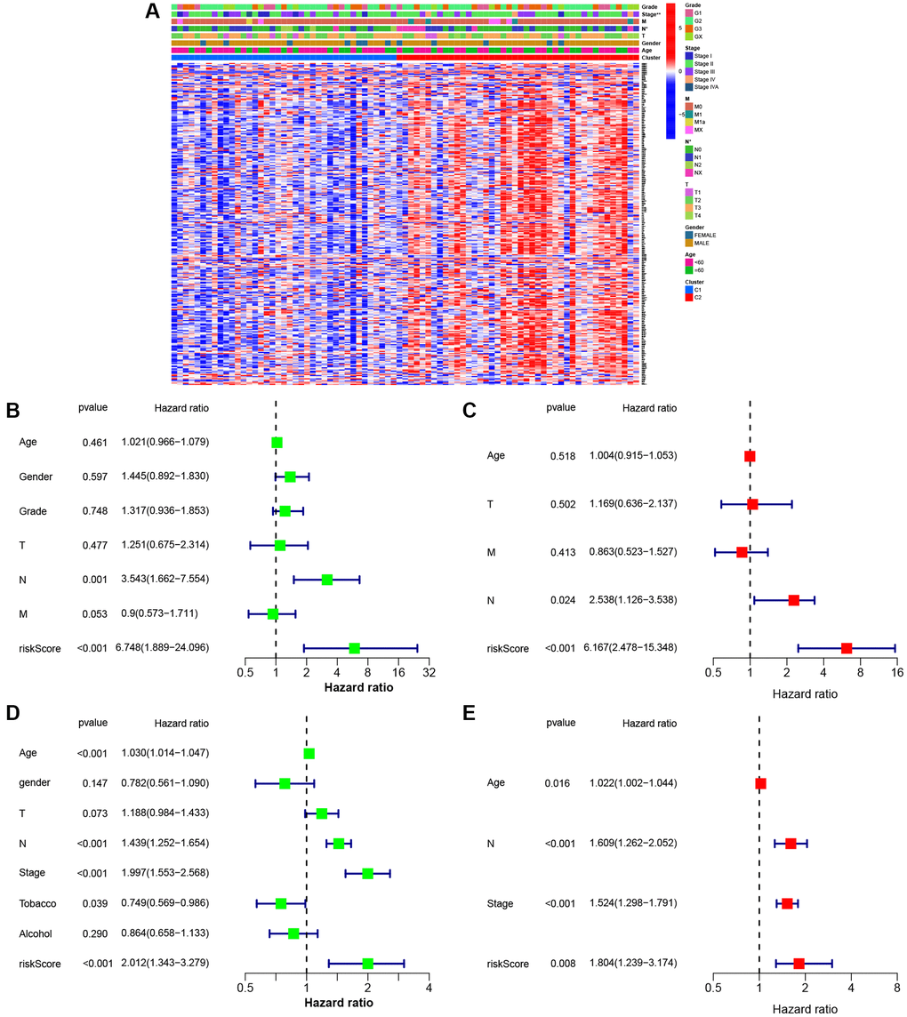 Figure 5A represents eight gene expressions of ESCC cases and associated clinical data. Meanwhile, the heatmap described 12 diverse clinicopathological feature distributions depending on our risk model-determined risk scores of cases. Univariate and multivariate Cox regression was applied in assessing whether our as-constructed risk model independently predicted ESCC prognosis. According to Figure 5B–5E, our constructed risk model independently predicts ESCC prognosis.