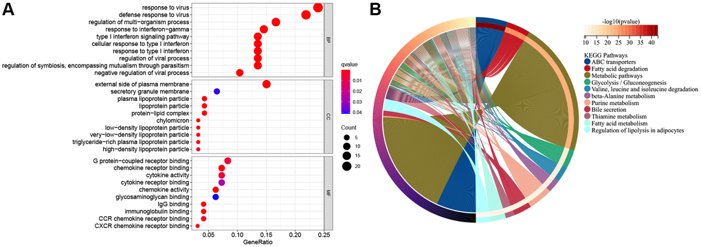 For better understanding functions of candidate genes and pathways across diverse molecular subtypes, 293 DEGs were obtained from the TCGA cohort upon the thresholds of |log2FC|≥1 and FDR < 0.05. Thereafter, the selected DEGs were subjected to GO functional annotation and KEGG pathway enrichment. Figure 6A and 6B represents significantly enriched biological processes (BPs). Therefore, DEGs were associated with several biological and cellular activities, like G protein-coupled receptor binding, the external side of the plasma membrane, response to the virus, ABC transporters, fatty acid degradation, metabolic pathways and so on.