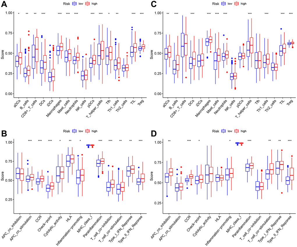All TCGA-derived cases were classified as high- or low-risk groups based on the median risk score value. ssGSEA was conducted to compare enrichment scores for 16 TIICs and activities of 13 immune pathways between both groups. In TCGA-derived cases, high-risk patients had increased TIIC levels of activated dendritic cells (aDCs), B cells, CD8+T cells, DCs, macrophages, mast cells, neutrophils, plasmacytoid dendritic cells (pDCs), T-helper cells, Th1-cells, Tfh, Tregs and tumor-infiltrating lymphocytes (TILs) (Figure 7A). Figure 7B shows the enrichment of immune-related functions for high-risk patients. High-risk patients were clearly associated with increased APC co-stimulation, checkpoint, CCR, HLA, cytolytic activity, parainflammation, inflammation-promoting, T cell-co-stimulation, T cell co-inhibition, Type I and Type II IFN responses. In GEO-derived cases, high-risk patients had increased TIIC levels of aDCs, B cells, DCs, macrophages, mast cells, neutrophils, Th1-cells, T-helper cells, Tregs, and TILs (Figure 7C). Figure 7D shows the enrichment of immune-related functions for high-risk patents. Clearly, high-risk patients were associated with the increased APC co-inhibition, checkpoint, CCR, parainflammation, inflammation-promoting, T-cell-co-stimulation, Type I and Type II IFN responses.