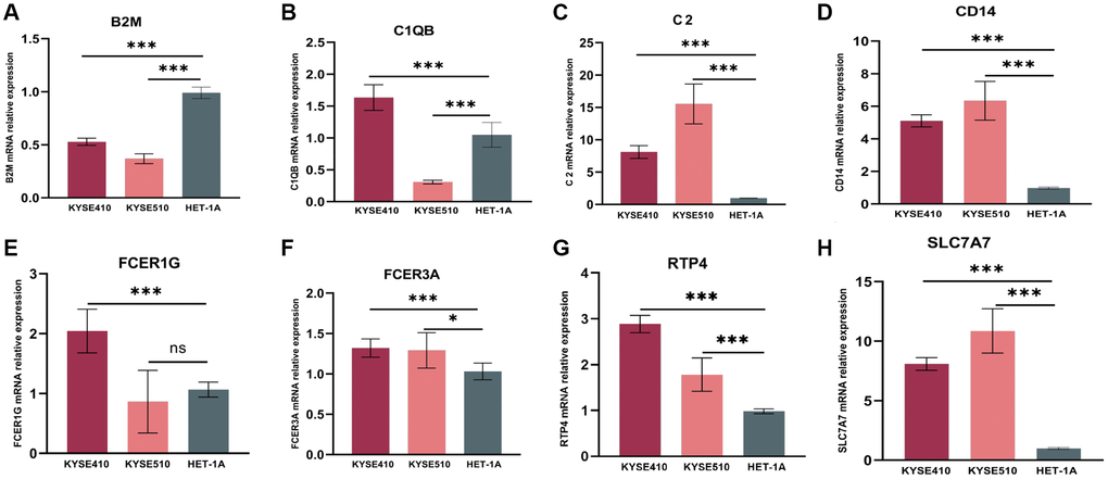 As confirmed by ESCC cells (KYSE410, KYSE510) and normal epithelium of esophagus (HET-1A) obtained from Hunan Fenghui Biotechnology Co., Ltd. (Changsha, China) through qPCR, C2, CD14, RTP4, FCER3A, and SLC7A7 were highly expressed in KYSE410 and KYSE510 than normal cells (Figure 8A–8H). The expression of B2M, C1QB, and FCER1G did not show a significant difference, which could be a result of individual variability requiring an increased sample size.