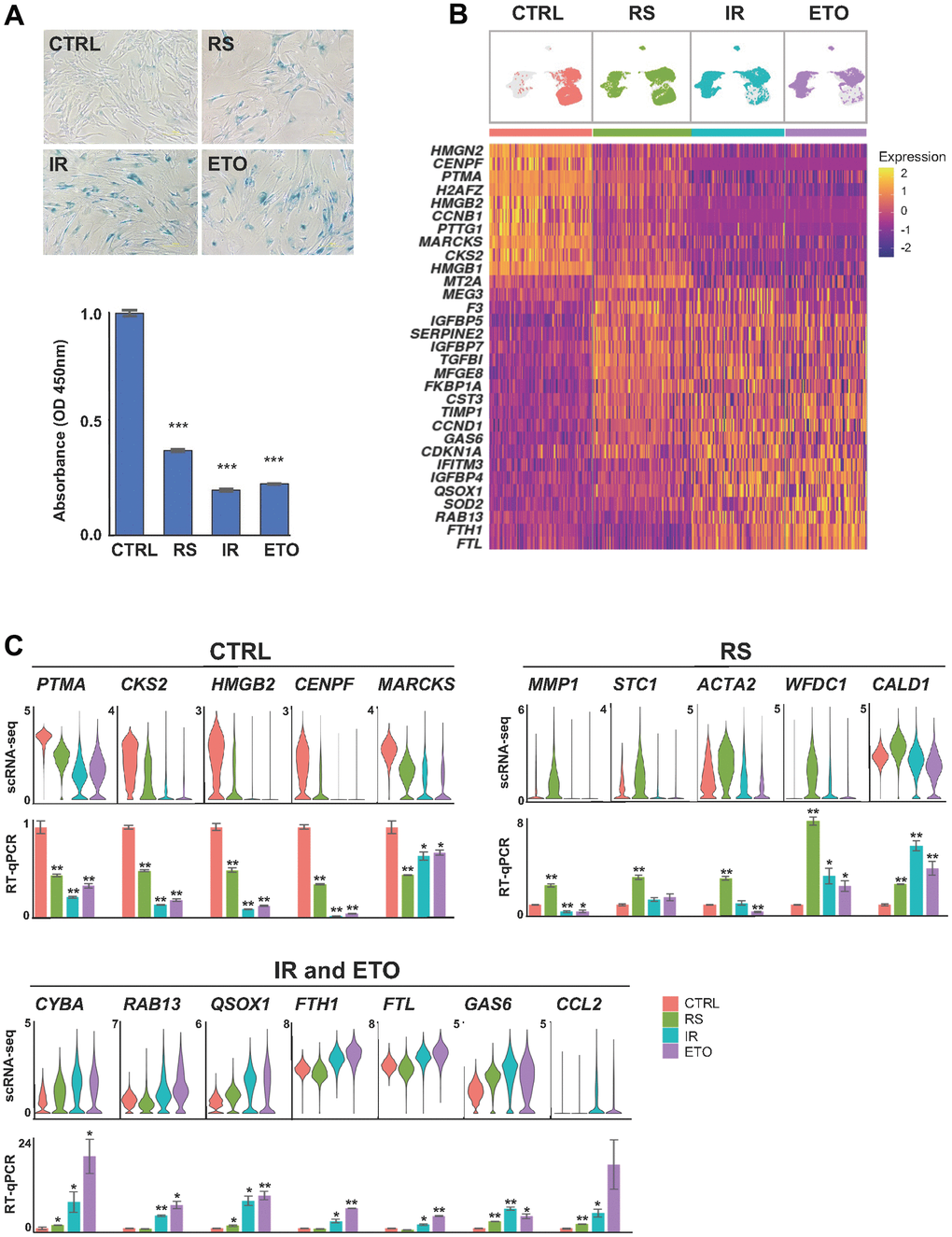 First, we sought insight into the differences in gene expression patterns across cells from each senescence model. UMAP analysis of the integrated data revealed broad transcriptomic heterogeneity across RS cells that vastly overlapped with CTRL, IR, and ETO samples (Figure 1B). In contrast, IR and ETO cell transcriptomes were more similar to one another and were different from the CTRL group. Interestingly, transcripts encoding cell cycle and proliferation proteins (e.g., CCNB1, PTMA, CKS2, or HMGB1/2 mRNAs) were lower in some of the RS cells and in most of the IR and ETO cells, in keeping with the broader transcriptomic diversity of the RS cell populations (Figure 1B and Supplementary Table 1). Markers commonly associated with cellular senescence, including CDKN1A, SERPINE2, IGFPB5/7, TGFBI, and CCND1 mRNAs were upregulated in most cells from all senescence models when compared to proliferating (CTRL) cells. Other transcripts that were highly expressed in all senescence models, included RAB13, TIMP1, IGFBP5, and QSOX1 mRNAs. Accordingly, GSEA of GO gene sets showed enrichment of cell cycle and proliferation markers in CTRL cells, increased markers of extracellular matrix organization and cell adhesion in RS, as well as upregulation of autophagy, mitochondria and oxidative stress markers in IR and ETO cells (Supplementary Figure 1A). The expression levels of mRNAs from select top marker genes representing each experimental condition relative to CTRL cells by scRNA-seq analysis were validated by RT-qPCR analysis employing primer pairs designed specifically to amplify each mRNA. For validation by RT-qPCR analysis, the mRNAs chosen from the CTRL group were those most highly reduced in the three senescence models; for the RS validation group, the mRNAs chosen were those selectively elevated in this group relative to the CTRL, IR, and ETO groups; and given the extensive overlap between IR and ETO models, the abundant mRNAs preferentially expressed in both models were chosen for validation (Figure 1C and Supplementary Table 2).