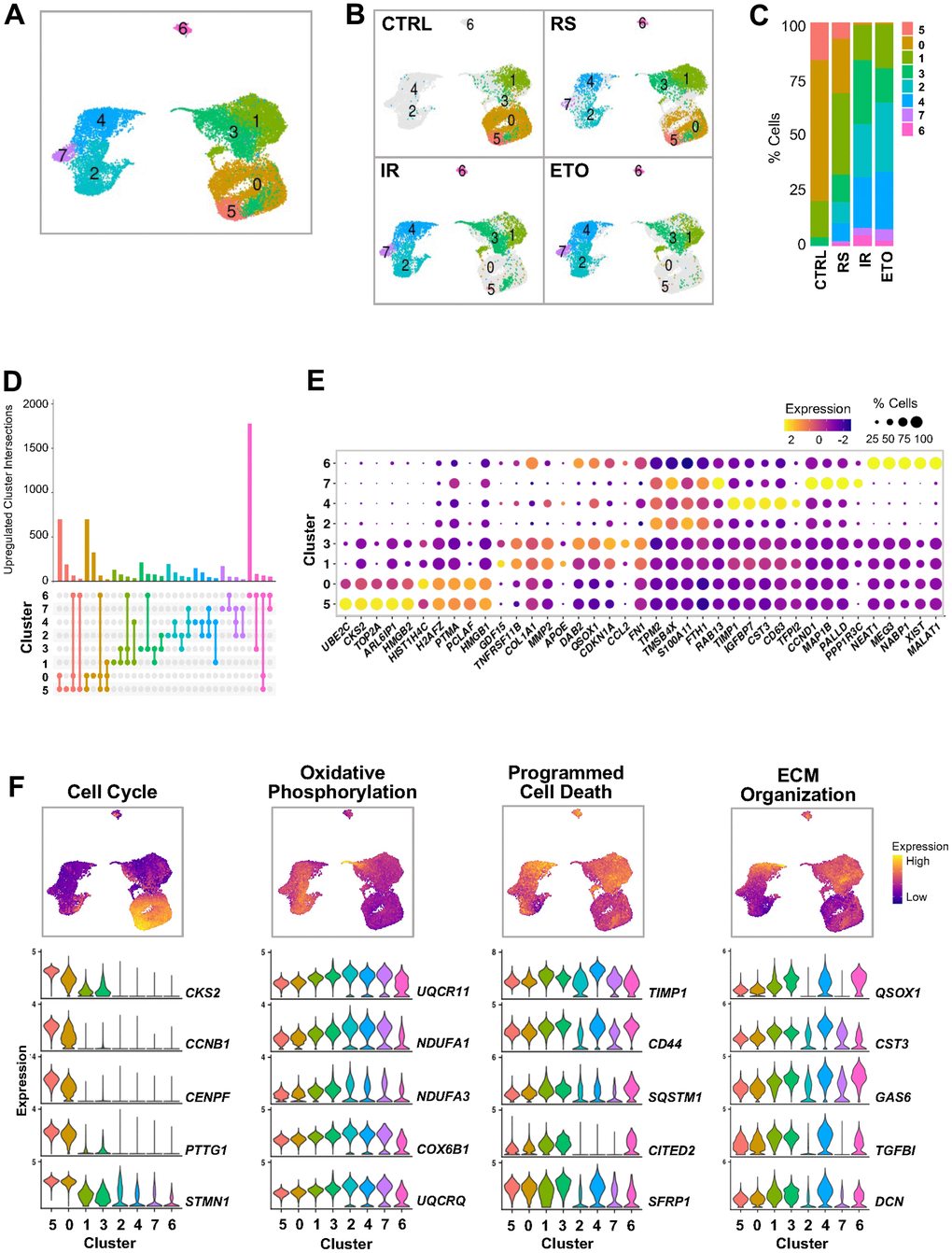 To explore the transcriptomic patterns and their contribution to the senescence models, we performed clustering analysis of the integrated data. The analysis identified eight cell clusters with distinct transcriptomic patterns organized into four major cell groups: clusters 5 and 0 in one group, clusters 1 and 3 in the second, clusters 2, 4, and 7 in the third, and cluster 6 at the greatest distance from other clusters in the UMAP space (Figure 2A). Cells in the CTRL, RS, IR, and ETO showed different distributions across these groups (Figure 2B, 2C and Supplementary Table 3).