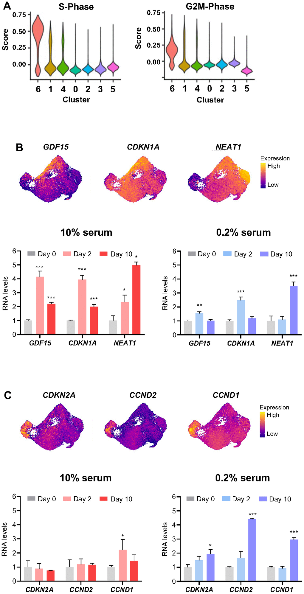 Given that the cell cycle stage may influence the cellular response to stress conditions, we asked if the cell cycle phase of the abundant clusters (6, 1, 4, and 0) at Day 0 (untreated) might inform us about different responses to ETO treatment. To check this possibility, we assigned a cell cycle phase score to individual ETO time course cells by using ‘CellCycleScoring’ function in Seurat. We found that the majority of cells from cluster 6 and many cells from clusters 1 and 4 exhibited high scores for S and G2/M phase (Figure 4A), supporting the proliferative state of these populations which were more abundant on Day 0 but were significantly diminished on Day 1 after ETO treatment; instead, on Day 1, we observed the appearance of cluster 2 transcriptome, with upregulation of DNA damage response (DDR) mRNAs (Figure 3). Cell cycle phase scores further confirmed that cluster 0 cells were growth arrested and only changed slightly with exposure to ETO (Figure 4A). Remarkably, RNA velocity vectors after ETO exposure (Figure 3B) showed that cluster 0, representing growth-arrested cells, progressed toward cluster 3, while (proliferative) cells in clusters 6, 1, and 4 were directed towards cluster 5. Thus, we postulated that in response to ETO, the proliferating cells of clusters 6, 1 and 4 shifted their gene expression patterns toward formation of the DDR population of cluster 2, and later progressed to cluster 5, adopting a senescence transcriptome. On the other hand, cell cycle-arrested, cluster 0 population perhaps responded to DNA damage only marginally, and further transitioned to adopt the transcriptome of senescent cells in cluster 3.