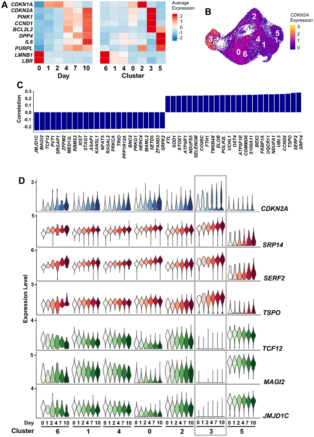 As one of the most referenced markers for senescence, we considered the high expression of CDKN2A mRNA in cluster 3 (Figure 5B) important for a deeper understanding of the heterogeneity of senescent cells. Analysis of the correlation of CDKN2A mRNA levels with the levels of other genes across all cells revealed positive correlation with multiple mRNAs encoding oxidative phosphorylation-related proteins (e.g., NDUFA1, UQCR11, COX6C, and NDUFS5 mRNAs) (Figure 5C). We also found time-dependent changes in CDKN2A mRNA and other transcripts that increased (SRP14, SERF2, and TSPO mRNAs) or decreased (TCF12, MAG12, and JMJD1C mRNAs) over time, reflecting a dynamic continuum of changes following ETO exposure (Figure 5D). The high similarity in gene expression patterns between clusters 3 and 0 recapitulates the similar transcriptomes of these two clusters seen earlier (Figure 3C, 3D), further solidifying the possibility of transitions between cells in clusters 0 and 3. However, the predominant accumulation of cells with high CDKN2A mRNA expression in cluster 3, accompanied by specific transcriptomic trajectories culminating in cluster 3 cells revealed by RNA velocity estimation (Figure 3B), suggests that this is a distinct subpopulation.