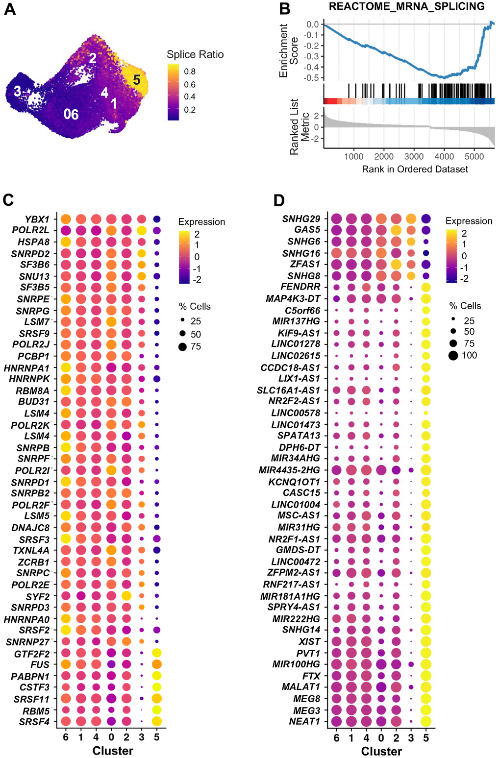 Cluster 5, contrary to cluster 3, showed low and unaltered levels of CDKN2A mRNA and CDKN2A-correlated genes over time after ETO exposure (Figure 5D). Instead, an interesting feature of the transcriptome in cluster 5 became apparent by analyzing RNA velocity, which distinguished pre-mature (unspliced) from mature (spliced) RNAs. Calculation of the splice ratio for each cell (Materials and Methods) showed increased unspliced RNAs in cluster 5 cells when compared to the rest of the cells (Figure 6A and Supplementary Figures 5A, 6A). It is noteworthy that, similarly to cluster 5, cluster 6 in the combined analysis of senescence models (Figure 2) also exhibited increased unspliced RNA levels (Supplementary Figures 5B, 6B, 6C), confirming the reproducibility of this feature through different approaches. To search for factors that could influence decreased RNA splicing in cluster 5 cells, we performed GSEA of the “REACTOME_MRNA_SPLICING”, a set of genes encoding proteins that regulate RNA splicing. The discovery of a negative enrichment score of this gene set in cluster 5 cells suggested that these cells expressed reduced levels of splicing factors compared to all other clusters (Figure 6B). As shown in Figure 6C, while most of these mRNAs encoding RNA splicing proteins were widely expressed across manifold clusters, they were strongly downregulated in cluster 5 (Supplementary Table 7), perhaps affecting the RNA processing events specifically in this cluster. Interestingly, many lncRNAs appeared as top markers distinguishing cluster 5 from other clusters (Figure 3C and Supplementary Table 6). Given the emerging role of lncRNAs as important modulators of gene expression in multiple cellular processes, including senescence, we evaluated changes in expression of lncRNAs across all clusters, finding again that most of them were selectively elevated in cluster 5 (Figure 6D and Supplementary Table 8). In sum, we found two distinct subpopulations of senescent cells (Supplementary Figure 7): cluster 3 cells express high levels of the traditional senescence marker CDKN2A and cluster 5 cells show dysregulated RNA splicing and high expression of multiple lncRNAs.
