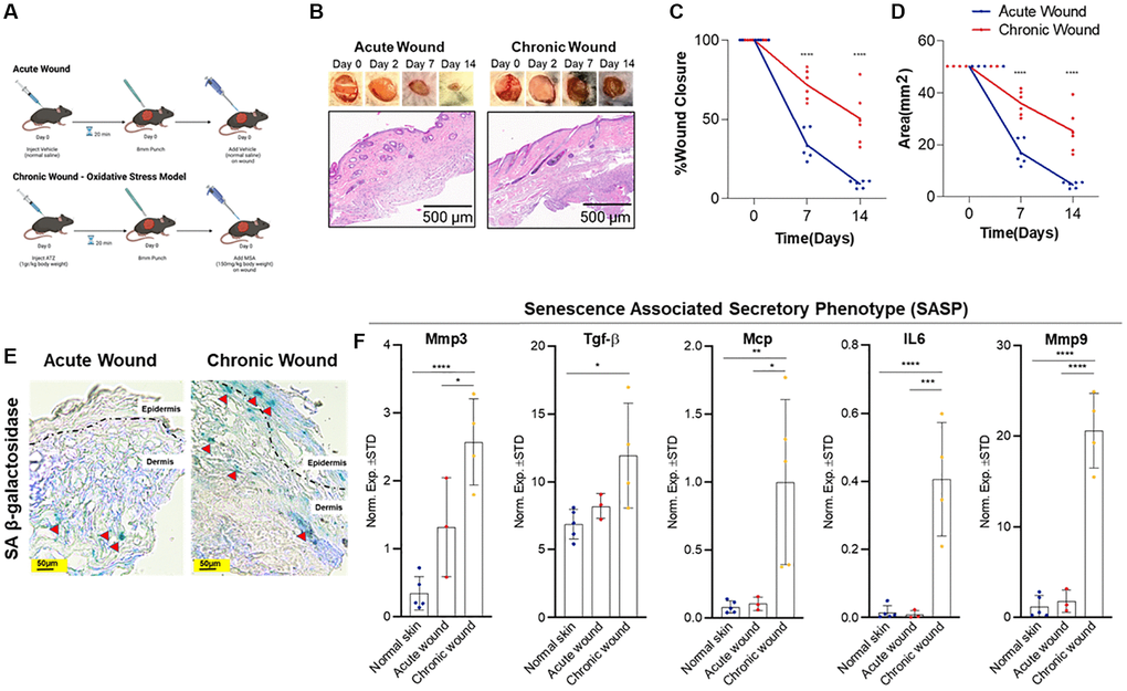 Senescent cells can have a complicated secretome that includes a variety of cytokines, chemokines, and proteases, among other factors [19, 37]. This SASP, also known as the senescence messaging secretome (SMS) [19], indicates senescent cells’ non-cell autonomous functioning and may explain their in vivo participation in chronic wound pathophysiology. MMPs play essential roles in all wound healing phases: during the inflammatory phase, they remove damaged extracellular matrix (ECM); throughout the proliferation phase, they collapse the capillary basement membrane, facilitating angiogenesis and cell migration; and during the remodelling phase, they contract and reconstruct skin tissue. All wounds require a threshold of these enzymes for optimal healing. However, high enzymatic activities can cause excessive breakdown and decreased wound healing [38]. For example, TGF-β has been demonstrated to induce senescence and senescence-related characteristics in fibroblasts [39]. Similarly, MCP has been shown to be a SASP-related protein [40]. We found significantly elevated Mmp3, Mmp9, Mcp, and TGF-β mRNA levels in chronic wounds (Figure 1F), potentially contributing to the increased senescent cell abundance in chronic wounds.