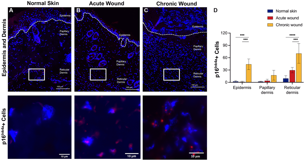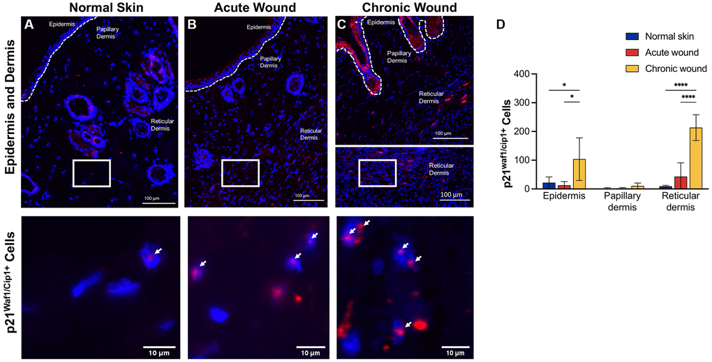 CDKs phosphorylate and modulate various proteins are involved in cell cycle progression. CDK inhibitors encoded in the CDKN1A (p21Waf1/Cip1), CDKN2A (p16Ink4a), and CDKN2B (p15Inc4b) loci are key drivers of cell cycle arrest in senescent cells [41] and have been used as markers of cellular senescence [13, 42, 43]. RNA in situ hybridization data evaluated p16Ink4a (Figure 2) and p21Waf1/Cip1 (Figure 3) in the epidermis, papillary dermis, and reticular dermis. Low numbers of p16Ink4+-positive cells were identified in the epidermis and papillary dermis (Figure 2A–2C). There was a statistically significant higher number of p16Ink4a cells with 2–3 nuclear foci in chronic wounds (Figure 2D). In contrast, there were higher numbers of p21Waf1/Cip1-positive cells in the epidermis and reticular dermis of chronic wounds, with 2–3 prominent nuclear foci compared to acute wounds (Figure 3A–3C). This was statistically significantly higher in chronic wound beds compared to normal skin and acute wounds (Figure 3D).