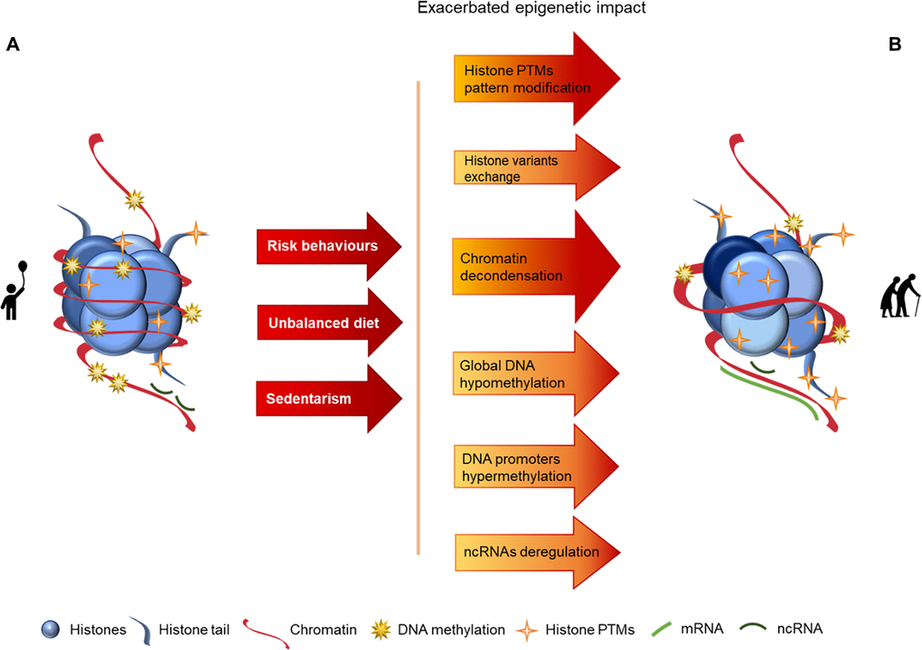 Epigenetics can be defined as de novo or inherited reversible modifications of the genome, which can affect gene expression without altering the DNA sequence. Epigenetic alterations are mediated by multiple mechanisms, of which histone modifications, DNA methylation and changes in non-coding RNAs expression are the best studied [18, 27] and whose alterations with aging are schematized in Figure 1.