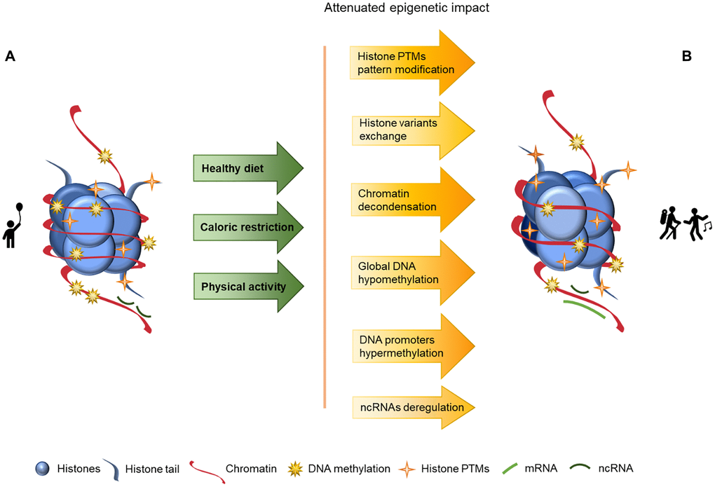 Aging is a complex and natural process in every living organism’s life cycle and it manifests in many ways, including epigenetics. In this article we explore aging and its associated epigenetic changes as well as how these changes may be delayed or reversed through nutrition, caloric restriction and sustained physical activity, as schematized in Figure 2. In this Figure we may observe a looser chromatin structure in the component B than in the component A, as well as lower levels of DNA methylation and increased histone PTMs, but nonetheless these values are closer to the component A than to the component B presented in Figure 1, where lifestyle strategies to promote a healthy aging are not considered, and consequentially imply an overall increase of chromatin instability.