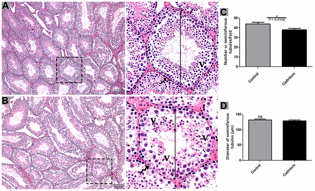 According to histological analysis, the control group showed the Sertoli cells were characterized by a compact morphology, and the more developing germ cells and permanent Sertoli cells were lined at the seminiferous tubules of testis. Furthermore, a significantly higher number of seminiferous tubules were observed in control group compared to the cadmium group without a change in seminiferous tubules diameter (Figure 1A). Controversially, in cadmium treated group, the luminal compartment of seminiferous tubules showed significantly reduced number of developing spermatogonia, spermatocytes, spermatids and spermatozoa. Additionally, disorganization of seminiferous tubules with extensive degenerative vacuolation and empty intercellular space between the germ cells were observed (Figures 1B, 2A, 2B). The above listed criteria were calculated through the Johnsen score. Johnsen score was highest in the control group, indicating normal spermatogenesis and germ cells development, whereas the contrary was the case in the cadmium group, indicating hypo-spermatogenesis.