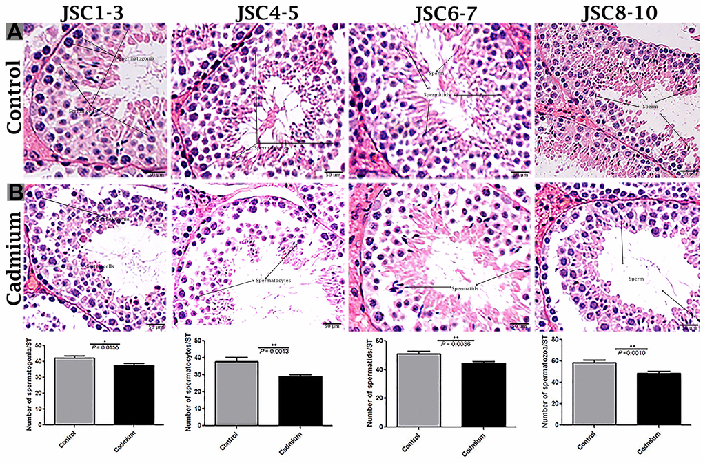 6-week-old male C57BL/6 mice were obtained from Jiangsu University’s Experimental Animal Center (Jiangsu, China). The Yangzhou University Institutional Animal Care and Use Committee approved the study, which was carried out in accordance with the National Research Council’s Guide for the Care and Use of Laboratory Animals (approval ID: SYXK (Su) 2017- 0044). A total (n = 30) mice were randomly divided into two groups: the control group (n = 15) (which received double distilled water), and the cadmium group (n = 15) (which received 50 mg/L Cd). Water was freely available to both groups. The trial period was 12 weeks (February to April). Average body weight of each mature male C57BL/6 mice was 28.1±2.4 (control group) and 26.1±1.9 (cadmium group) After 12 weeks, all mice were anesthetized with 2% sodium pentobarbital and sacrificed through cervical dissection. The testes were quickly collected and fixed to perform the below techniques.