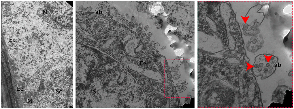 Transmission electron microscopy revealed that during the control group’s spermatogenesis, numerous MVBs and a limited number of autophagosomes were dispersed in the seminiferous tubules (Figure 3A). Likewise, well-developed Ee and MVBs were observed in the cytoplasm of Sertoli cells. Collectively, Sertoli cells possessed exocytic pathway, and showed some apical blebs containing various-sized nano-scale exosomes located to cell surface. Finally, apical blebs were fragmented and contents were released, and these nano-scale exosomes were directly associated with spermatozoa in luminal compartment of the seminiferous tubules of testis (Figure 4).