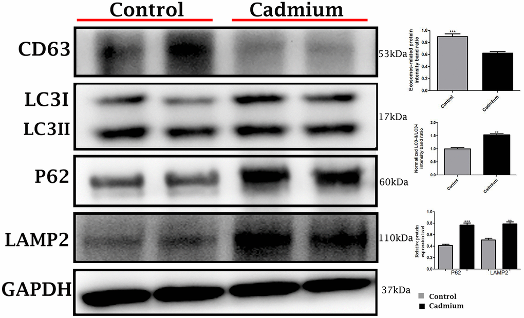 Conversely, in cadmium treated group there is very limited biogenesis of MVBs and no obvious secretions of nano-scale exosomes that interacted with spermatozoa were observed. The higher formation of autophagosomes were observed in the Sertoli cells of seminiferous tubules. Fascinatingly, the autophagosomes were enveloped by MVBs that later formed the amphisome that were degraded by lysosome (Figure 3B). As further confirmation, the immuno-blots protein expression was performed and confirmed the protein signaling of CD63 exosomal protein and autophagy-related proteins like a LC3, P62 and LAMP2. The expression level of CD63 protein was significantly reduced and LC3, P62 and LAMP2 proteins were significantly increased after cadmium treatment (Figure 5). Overall, findings demonstrated that the cadmium inhibits the secretion of nano-scale exosomes and MVBs in the Sertoli cells due to the over-activation of autophagy, which sustenance the homeostasis of spermatogenesis.