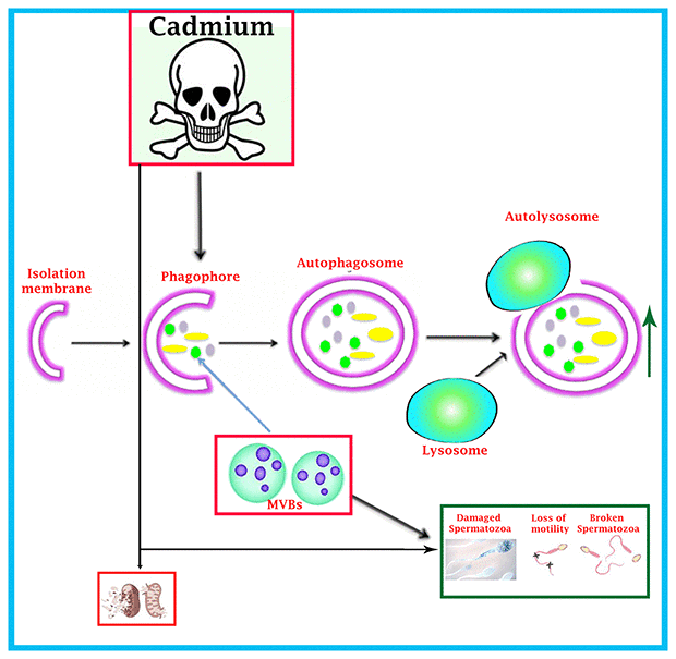In summary, we have demonstrated that cadmium has obvious toxic effect on the exocytosis pathway of exosomes-MVBs secretion, as evidenced by the inhibition of biogenesis of MVBs and exosomes secretion and over activation of the autophagic pathway in the luminal compartment of seminiferous tubules of testis, that lead to spermatozoa which were deprived from immunological defense mechanism of nano-scale exosomes and consequently, more degenerated and abnormal development of spermatozoa were observed during spermatogenesis (Figure 8). Thus, this study provides novel insight into the toxicological effect of cadmium on immunological role of nano-scale exosomes in the male reproductive system.