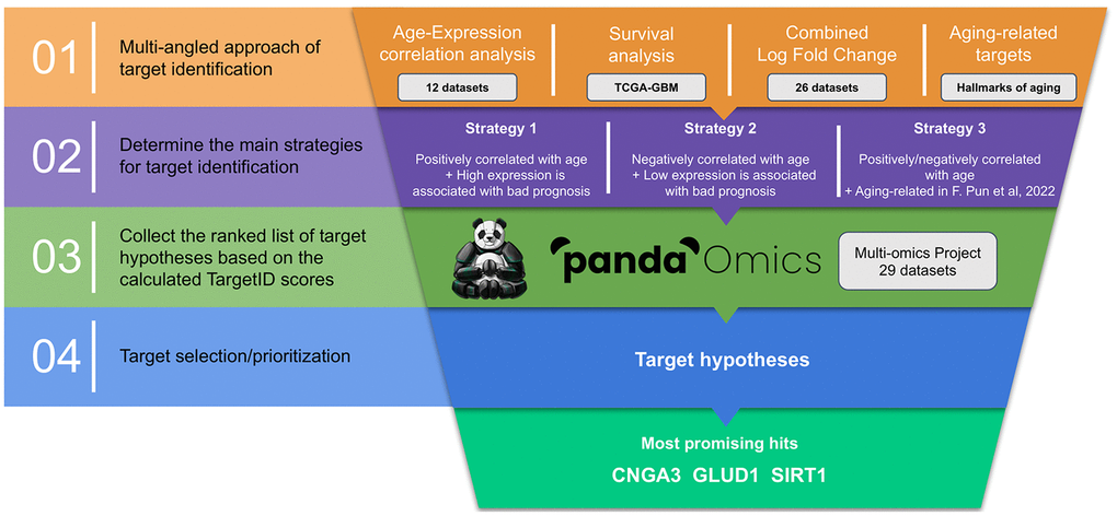 Due to the variety of mutations and development of GBM across different ages [3], this study utilized artificial intelligence (AI) and age-correlation analysis with the goal to identify dual-purpose targets associated with aging and GBM leveraging the power of AI-driven PandaOmics platform, which integrates analysis of multi-omics and literature data. Recently, the platform has been demonstrated to predict novel age-associated targets for the purpose of drug discovery [12].