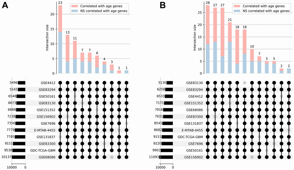 Normalized gene expression matrixes along with patients’ age metadata were collected from PandaOmics for 12 transcriptomics datasets. Spearman’s rank correlation coefficients between gene expression and age, as well as corresponding p-values, were calculated for each gene separately for each dataset using only case samples. Lists with positively and negatively correlated genes were analyzed and plotted independently using the upsetplot python package with min_degree = 11. In order to calculate the significance of the correlation coefficients across all datasets, Stouffer’s method was applied for previously obtained Spearman’s correlation p-values. Finally, 2 lists of genes significantly correlated with age (Stouffer’s combined p-value < 0.05) were obtained.
