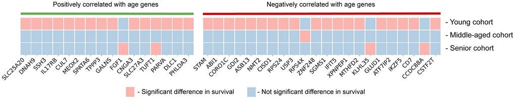 We performed a survival analysis for the genes that were significantly correlated with age, using the TCGA-GBM [29] dataset. First, we divided patients into three cohorts: young (< 45 years), middle-aged (from 45 to 60 years) and senior (> 60 years). Then for each cohort, we performed survival analysis according to the expression level of the analyzed gene. 16 out of 38 significantly positively correlated genes and 22 out of 92 significantly negatively correlated genes were able to stratify patients by survival according to their expression level (Figure 3). It is important to mention that most genes were able to significantly stratify the cohort of young patients.