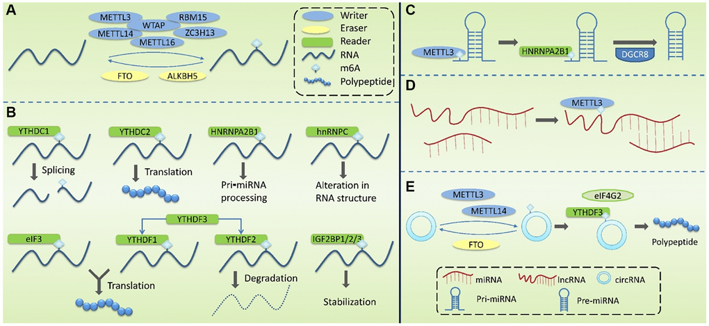m6A methylation is a dynamic and reversible process [51], which is regulated by m6A methyltransferase complexes (m6A writers), m6A demethylases (m6A erasers), and m6A-binding proteins (m6A readers) (Figure 2A, 2B).