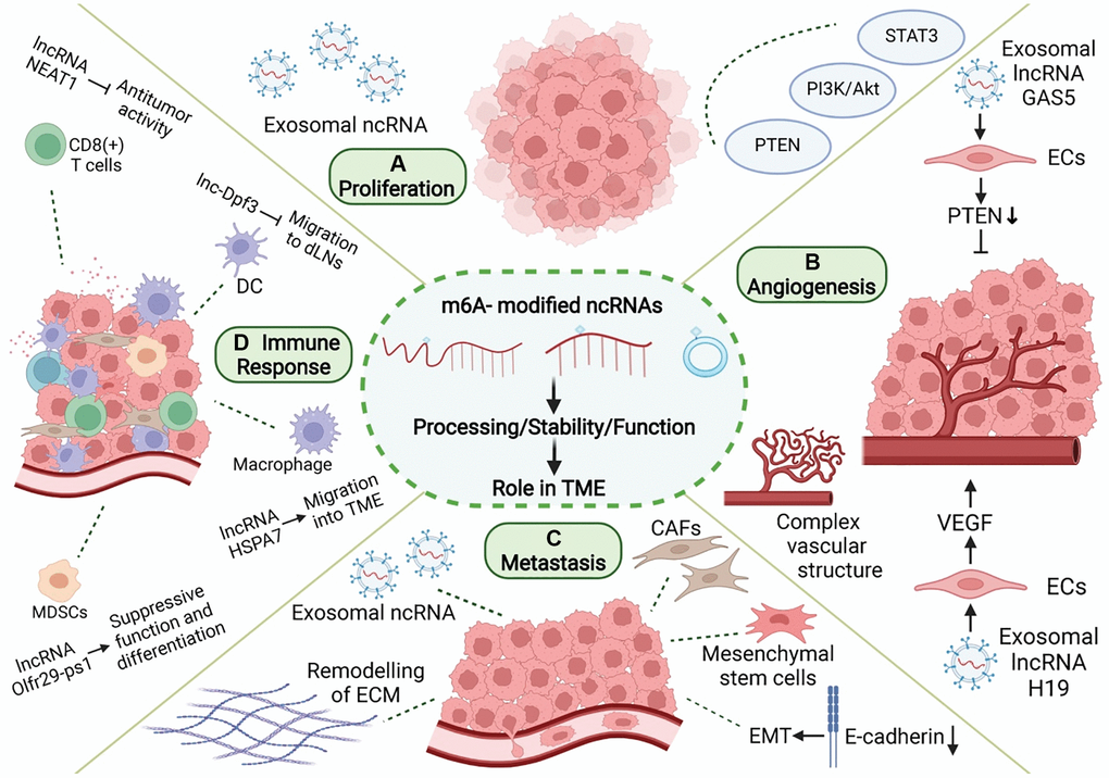 During tumorigenesis, tumor cells interact closely with stromal cells and immune cells in the microenvironment, jointly transforming the microenvironment into a site conducive to the growth, invasion, and metastasis of tumor. m6A-related ncRNA, as an important means of intracellular regulation of gene expression and functional status, as well as intercellular communication, can promote the formation and maturation of TME and play an important role in proliferation, angiogenesis, invasion, metastasis, immune escape, and other processes in tumor (Figure 4).
