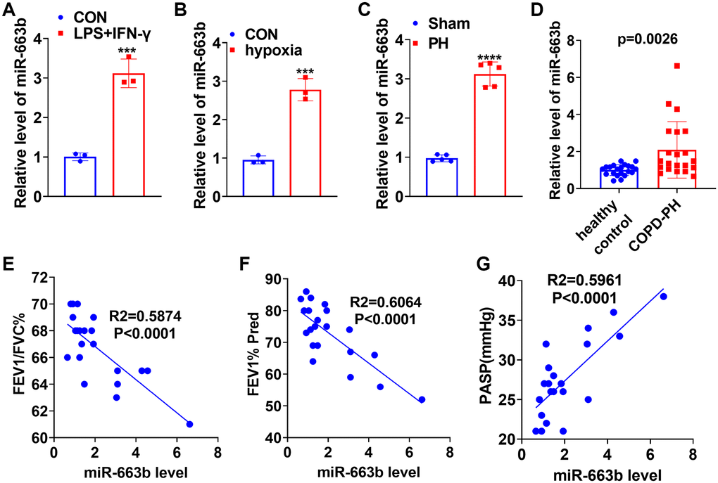 To confirm the expression features of miR-663b in M1 macrophages, we treated THP-1 cells with LPS (10 μg/mL) plus IFN-γ (20 ng/ml) for 24 hours to elicit macrophage M1 polarization. RT-PCR data displayed that in contrast with the CON group, the profile of miR-663b was elevated in macrophages (Figure 1A). For the purpose of a probe into the expression features of miR-663b in the context of pulmonary hypertension, we treated PASMCs with hypoxia to build an in-vitro pulmonary hypertension model. The RT-PCR result exhibited that by contrast to the CON group, there was an increase in miR-663b expression in hypoxia-treated PASMCs (Figure 1B). Moreover, a hypoxia-elicited pulmonary hypertension rat model was set up, with RT-PCR implemented to measure miR-663b expression in the rat serum. It turned out that vis-à-vis Sham, the miR-663b level in the serum of the pulmonary hypertension rats was heightened (Figure 1C). We collected serum samples from 22 patients with COPD pulmonary arterial hypertension (IPAH) and 22 healthy controls (HC). miR-663b level was detected and we found that serum miR-663b level was significantly elevated in patients with COPD-PH compared with that of healthy controls (Figure 1D), and higher miR-663b level was significantly associated with the severity of COPD-PH patients (Figure 1E–1G). All these findings revealed that miR-663b presented a high expression in M1 macrophages and in the in-vivo and ex-vivo models of pulmonary hypertension.