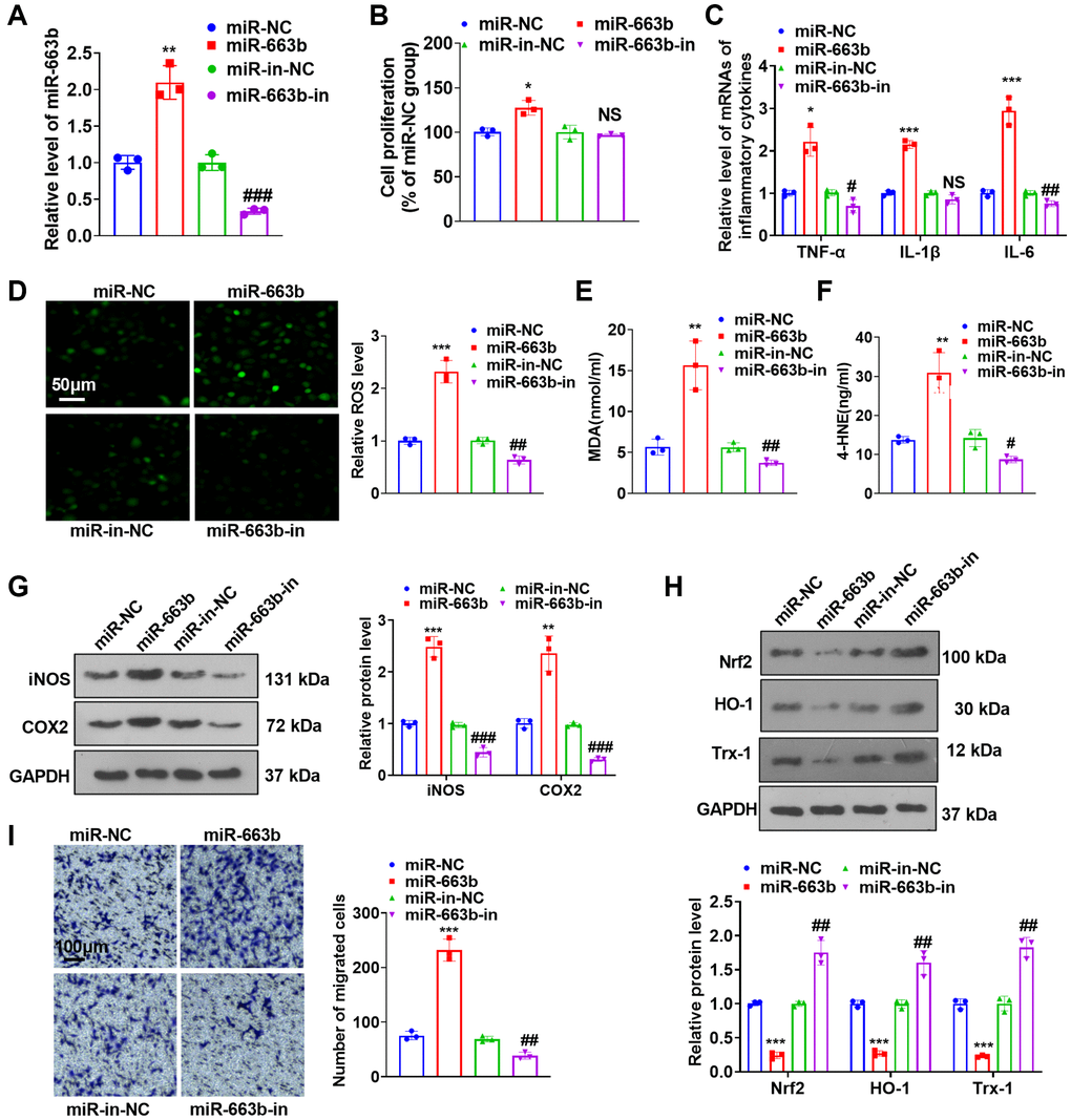 To investigate the influence of miR-663b on PASMC dysfunction, we transfected miR-NC, miR-663b mimics, miR-in-NC, and miR-663b inhibitors into PASMCs and implemented RT-PCR to verify the transfection efficiency (Figure 2A). CCK8 assay reflected that miR-663b overexpression facilitated PASMC proliferation (Figure 2B). The data of RT-PCR reflected that miR-663b enhancement led to increased profiles of inflammatory factors (TNF-α, IL-1β, and IL-6), whereas miR-663b down-expression reduced the levels of the inflammatory factors in the cells (Figure 2C). Cell immunofluorescence and colorimetry displayed that miR-663b overexpression aggravated the production of ROS levels and MDA and 4-HNE contents in PASMCs. miR-663b inhibition showed reversed results (Figure 2D–2F). Western blot indicated that PASMCs subsequent to miR-663b overexpression had an uplift in the profiles of inflammation-concerned proteins iNOS and COX2 and a decrease in those of oxidative stress-correlated proteins Nrf2, HO-1, and Trx-1. By contrast, miR-663b low expression resulted in the opposite phenomena (Figure 2G, 2H). As evidenced by Transwell assay, miR-663b overexpression fortified PASMC migration and miR-663b low expression reduced cell migration (Figure 2I). All the data revealed that miR-663b overexpression aggravated the proliferation, inflammation, oxidative stress, and migration of PASMCs.