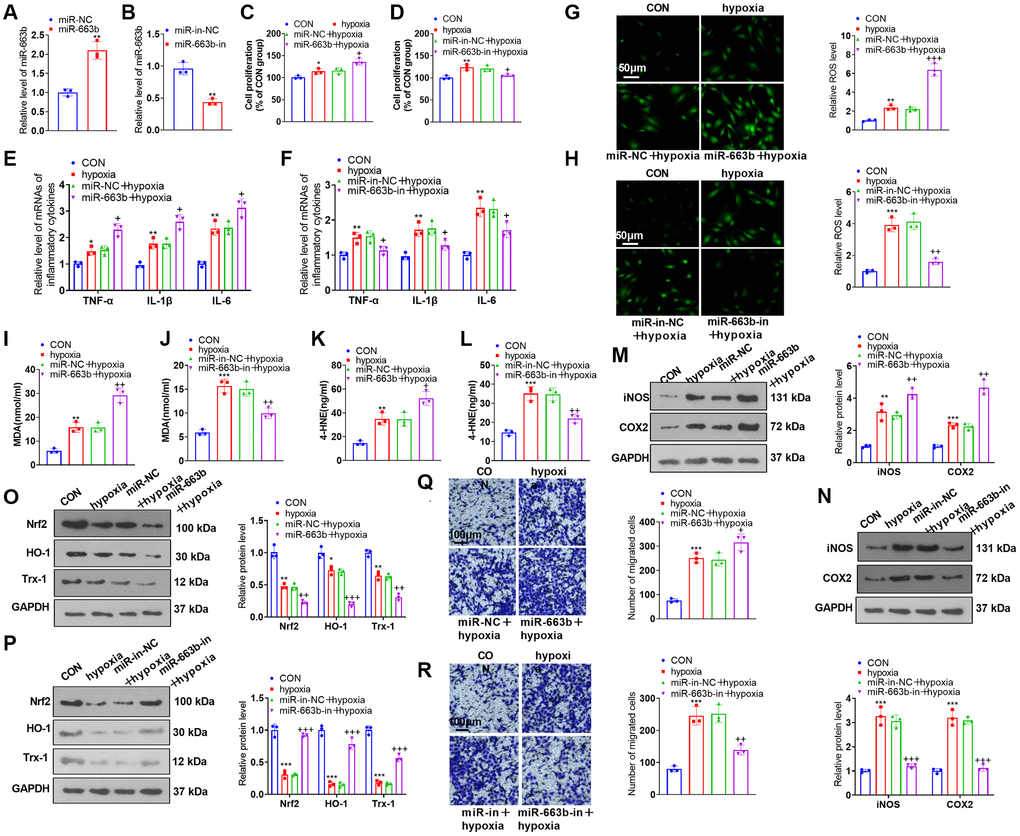 To investigate the influence of miR-663b on PASMC damage induced by hypoxia, we transfected miR-NC, miR-663b mimics, miR-in, and miR-663b inhibitors into PASMCs and implemented RT-PCR to verify the transfection efficiency (Figure 3A, 3B). Functional assays showed that hypoxia strengthened PASMC proliferation, inflammatory cytokine levels, and oxidative stress (Figure 3C–3L). When contrasted with the hypoxia+miR-NC group, miR-663b overexpression bolstered cell proliferation, inflammation, and oxidative stress. However, miR-663b inhibition reversed the dysfunctions of PASMCs under hypoxia treatment (Figure 3C–3L). Western blot indicated that PASMCs subsequent to hypoxia treatment gained upregulated expression of iNOS and COX2, and downregulated Nrf2, HO-1 and Trx-1 levels. Overexpressing miR-663b enhanced iNOS and COX2 expressions and restrained Nrf2, HO-1, and Trx-1 expressions, but miR-663b low expression resulted in the opposite phenomena (Figure 3M–3P). Transwell assay showed that hypoxia promoted PASMC migration, which was further enhanced by miR-663b overexpression and decreased by miR-663b inhibition (Figure 3Q, 3R). All our outcomes revealed that miR-663b overexpression stepped up proliferation, inflammation, oxidative stress, and migration in hypoxia-induced PASMCs, but miR-663b inhibition reversed the situation.