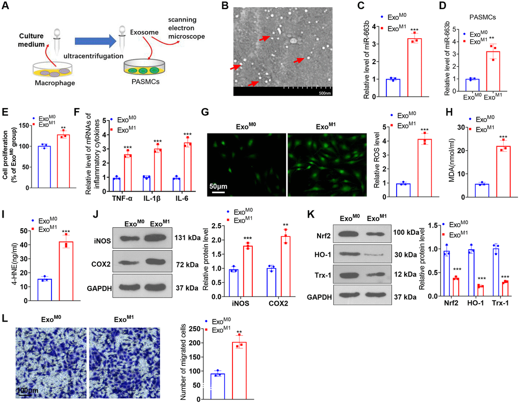 To understand the impact of M1 macrophages on PASMCs, we constructed a co-culture model of M1 macrophages and PASMCs (Supplementary Figure 1A). The functional assays showed that M1-polarized macrophages induced enhanced PASMC proliferation, inflammation, oxidative stress, and migration (Supplementary Figure 1B–1I). We harvested “M0” and “M1” macrophage exosomes through ultracentrifugation (Figure 4A). Scanning electron microscope (SEM) showed that the diameter of “exosomes” mainly ranges from 40–100 nm (Figure 4B). RT-PCR demonstrated that in contrast with the ExoM0 group, miR-663b expression was substantially up-regulated in M1 macrophage exosomes (Figure 4C). To probe the influence of M1 macrophage exosomes on PASMCs, we cultured PASMCs together with M0 and M1 macrophage exosomes (ExoM0, ExoM1). MiR-663b level was upregulated in PASMCs under ExoM1 treatment (Figure 4D). CCK8 assay indicated that by contrast to the ExoM0 group, ExoM1 boosted PASMC proliferation (Figure 4E). RT-PCR revealed that as opposed to the ExoM0 group, the ExoM1 group had a distinct increase in the profiles of inflammatory factors in PASMCs (Figure 4F). Cell immunofluorescence and colorimetry reflected that in contrast with the ExoM0 group, M1 macrophage exosomes elicited an increase in the levels of ROS, MDA, and 4-HNE in PASMCs (Figure 4G–4I). Western blot indicated that by contrast to the ExoM0 group, iNOS and COX2 expressions were considerably up-regulated, while Nrf2, HO-1, and Trx-1 expressions were vigorously down-regulated in PASMCs in the ExoM1 group (Figure 4J, 4K). Transwell suggested that in contrast with the ExoM0 group, M1 macrophage exosomes bolstered PASMC migration (Figure 4L). These findings confirmed that miR-663b was enriched in M1 macrophage exosomes, and M1 macrophage exosomes induced PASMC damage.