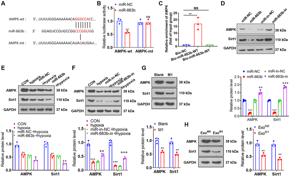 Through Targetscan database (https://www.targetscan.org/vert_72/) and microT databse (https://dianalab.e-ce.uth.gr/html/dianauniverse/index.php?r=microT_CDS), we found 288 gene targets are potentially targeted by miR-663b (Supplementary Figure 2A). The miRNA-gene target network was shown in Supplementary Figure 2B. Moreover, gene enrichment analysis was performed through the online database DAVID (https://david.ncifcrf.gov/home.jsp). The enriched KEGG pathways and biological themes, particularly GO terms (including biological process (BP), cellular component (CC), and molecular function (MF)), were shown in Supplementary Figure 2C–2F. Dual luciferase activity assay revealed miR-663b mimics vigorously attenuated the luciferase activity of AMPK-wt (versus miR-NC) (Figure 5A, 5B). RNA pull-down analysis showed that endogenous AMPK mRNA level was enriched specifically in miR-663b probe detection compared with Bio-NC group (Figure 5C). Western blot indicated that the profiles of AMPK and Sirt1 were lowered in PASMCs with miR-663b upregulated or treated with hypoxia. In contrast with the corresponding control group, miR-663b overexpression dampened AMPK and Sirt1 expressions, whereas miR-663b boosted their expressions in PASMCs elicited by hypoxia (Figure 5D–5F). In addition, the condition medium or exosomes from M1 macrophages could both repress AMPK and Sirt1 expressions in PASMCs (Figure 5G, 5H). These discoveries denoted that miR-663b targeted AMPK, and miR-663b overexpression hindered the AMPK/Sirt1 pathway.