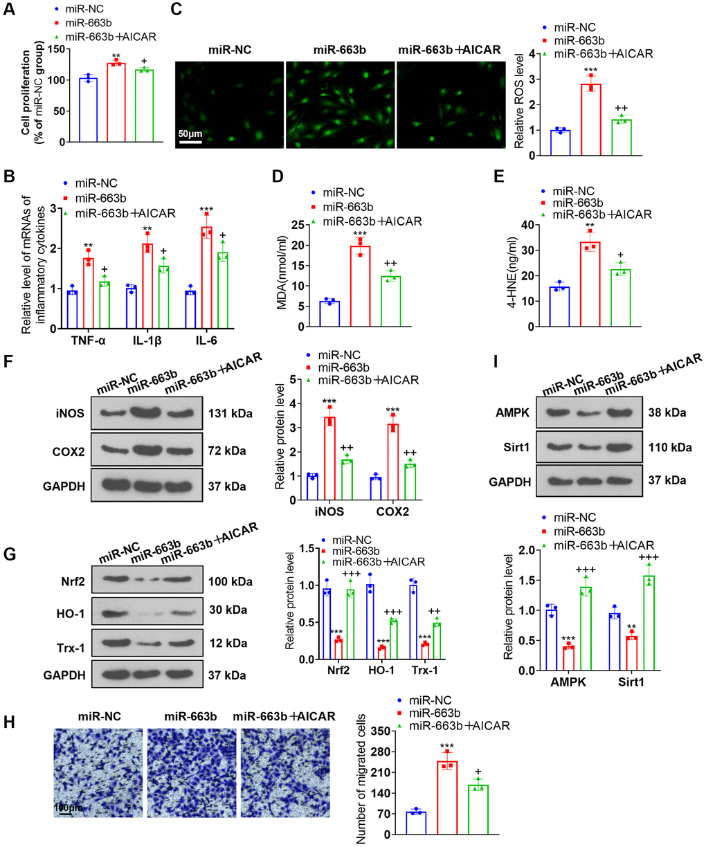 To ascertain the function of AMPK in PASMC damage, we transfected miR-663b mimics into PASMCs and applied the AMPK activator AICAR. As supported by functional assays, miR-663b overexpression boosted PASMC proliferation, the levels of inflammatory cytokines, ROS, MDA, and 4-HNE, but when contrasted to the miR-663b group, the group of miR-663b+AICAR underwent a reduction in cell proliferation, the levels of inflammatory cytokines, ROS levels and in MDA and 4-HNE contents (Figure 6A–6E). Western blot unveiled that iNOS and COX2 expressions went up, while Nrf2 and Trx-1 expressions were down in the miR-663b group vis-a-vis the miR-NC group. In contrast with the miR-663b group, AICAR restrained the profiles of iNOS and COX2 but enhanced those of Nrf2, HO-1, and Trx-1 (Figure 6F, 6G). Transwell reflected that vis-à-vis the miR-NC group, overexpressing miR-663b stepped up PASMC migration, but it was impeded following the administration of AICAR (Figure 6H). Western blot revealed that versus the miR-NC group, overexpressing miR-663b cramped AMPK and Sirt1 expressions, but they were heightened by AICAR (Figure 6I). These findings confirmed that AMPK activation mitigated the influence of miR-663b overexpression on PASMCs.