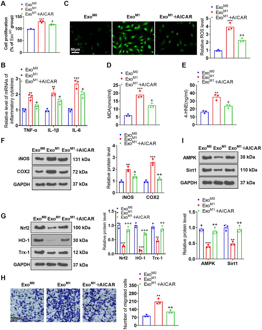We cultured PASMCs together with the exosomes of M0 and M1 macrophages and then applied the AMPK activator AICAR for treatment. AICAR suppressed PASMC proliferation (Figure 7A), the profiles of inflammatory factors (Figure 7B), the levels of ROS, MDA, and 4-HNE (Figure 7C–7E). Western blot unraveled that iNOS and COX2 expressions were abated, while Nrf2, HO-1, and Trx-1 expressions were elevated in the ExoM1+AICAR group vis-a-vis the ExoM1 group (Figure 7F, 7G). Transwell denoted that in contrast with the ExoM1 group, AICAR vigorously dampened PASMC migration (Figure 7H). Western blot disclosed that there was a reduction in AMPK and Sirt1 expressions in the ExoM1 group versus the ExoM0 group. In contrast with the ExoM1 group, AICAR boosted AMPK and Sirt1 expressions in PASMCs (Figure 7I). These phenomena demonstrated that AMPK activation mitigated the damaging impact of M1 macrophage exosomes on PASMCs.
