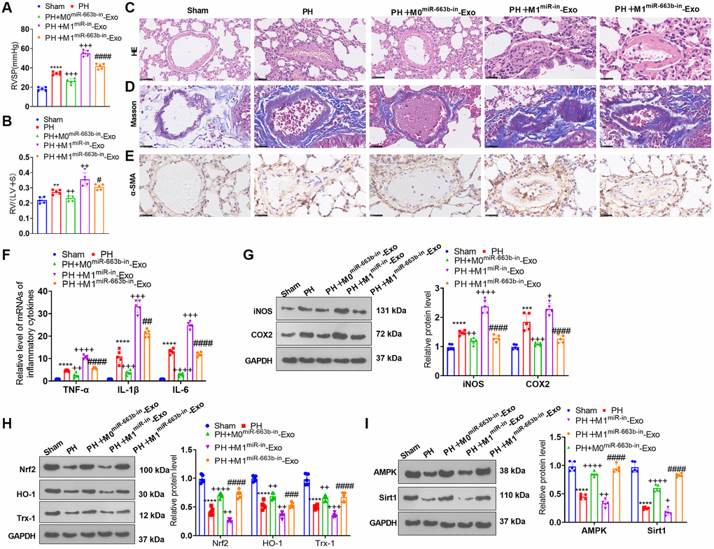 We built a pulmonary hypertension rat model induced by hypoxia and transfused M1 macrophage exosomes with low-expressed miR-663b into the caudal veins of the rats with a view to further corroborating the function of miR-663b in pulmonary hypertension. The hemodynamic assay revealed that the mean ratio of RVSP and RV/(LV+S) was remarkably higher in the PH group than in the Sham group. As compared with the PH group, the PH+M0miR-663b-in-Exo group had reduced RVSP and RV/(LV+S), and the PH+M1miR-in-Exo witnessed a notable increase in the mean ratio of RVSP and RV/(LV+S). In contrast with the PH+M1miR-in-Exo group, M1 macrophage exosomes with low-expressed miR-663b contributed to a stark reduction in the ratio (Figure 8A, 8B). HE staining, Masson staining, and IHC displayed that by contrast to the Sham group, PH rats manifested a reduced inner diameter of the pulmonary arteriole, narrowed lumen, and significant pulmonary remodeling. In contrast with the PH group, the rats in the PH+M1miR-in-Exo group exhibited thickened pulmonary arterioles, but the PH+M0miR-663b-in-Exo group and M1 macrophage exosomes with low-expressed miR-663b brought about a decrease in the thickness of the PH rat pulmonary artery media and distinctly alleviated the pathological damage of the lung tissues (Figure 8C–8E). RT-PCR denoted that by contrast to the Sham group, there was an increase in the levels of TNF-α, IL-1β, and IL-6 in the PH rat lung tissues. As opposed to the PH group, the PH+M1miR-in-Exo group displayed a dramatic uplift in the profiles of the inflammatory factors, while the PH+M0miR-663b-in-Exo group had a reduced inflammatory response. By contrast to the PH+M1miR-in-Exo group, M1 macrophage exosomes with miR-663b low expression lowered the profiles of the inflammatory factors in the PH rat lung tissues (Figure 8F). As evidenced by western blot, the profiles of iNOS and COX2 were heightened, and Nrf2, HO-1, and Trx-1 expressions were diminished in the lung tissues of the PH rats. The PH+M0miR-663b-in-Exo group had reduced profiles of inflammation-concerned proteins. Moreover, iNOS and COX2 proteins were dramatically elevated, and Nrf2, HO-1, and Trx-1 proteins were conspicuously abated in the PH+M1miR-in-Exo group vis-a-vis the PH group. By contrast to the PH+M1miR-in-Exo group, M1 macrophage exosomes with low-expressed miR-663b suppressed the profiles of inflammation-correlated proteins and enhanced those of oxidative stress-concerned proteins in the PH rat lung tissues (Figure 8G, 8H). Western blot revealed that in contrast with the Sham group, the profiles of AMPK and Sirt1 were attenuated in the PH rat lung tissues. As opposed to the PH group, the PH+M0miR-663b-in-Exo group had enhanced AMPK-Sirt1 expression, and the PH+M1miR-in-Exo group experienced a distinct reduction in their expressions. By contrast to the PH+M1miR-in-Exo group, M1 macrophage exosomes with miR-663b low expression heightened the profile of the AMPK/Sirt1 pathway in the PH rats’ lung tissues (Figure 8I). All our findings confirmed that M1 macrophage exosomes with miR-663b low expression mitigated pulmonary vascular remodeling in pulmonary hypertension rats.
