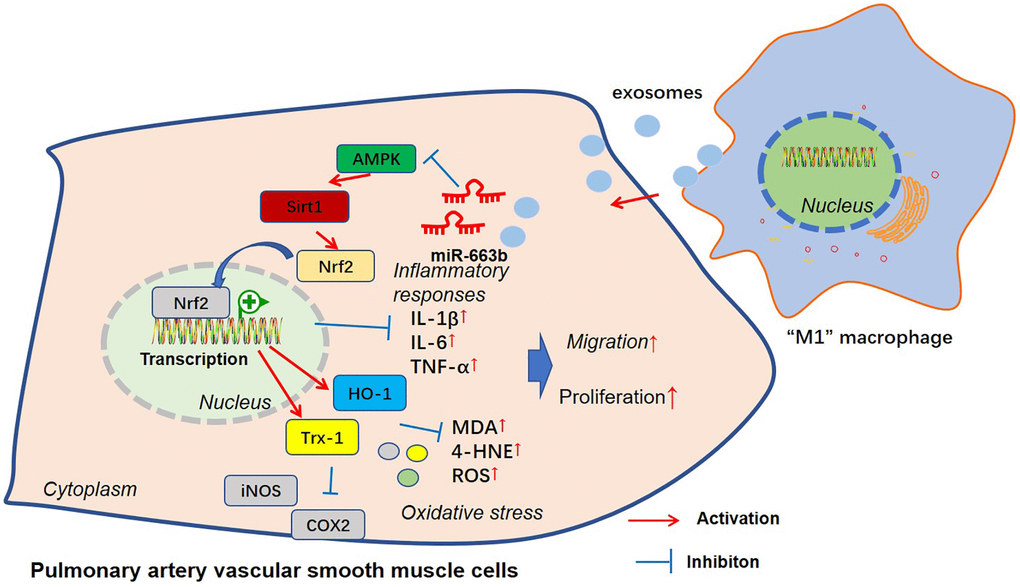 Our previous research has revealed that hypoxia-induced pulmonary artery smooth muscle dysfunction can be mitigated after improving mitochondrial morphology and ER stress [24]. Presently, we tried to figure out the role of miR-663b and “M1” macrophages in PASMC proliferation, inflammation, oxidative stress, and migration. miR-663b level was substantially heightened in M1-polarized macrophages, exosomes-derived form “M1” macrophages, and the pulmonary hypertension model. Protein kinase AMP-activated catalytic subunit alpha 2 (PRKAA2), a catalytic subunit of AMPK, is identified as a direct target of miR-663b. Thus, we speculated that miR-663b facilitated hypoxia-elicited PASMC damage potentially via targeting the AMPK/Sirt1 signaling pathway.