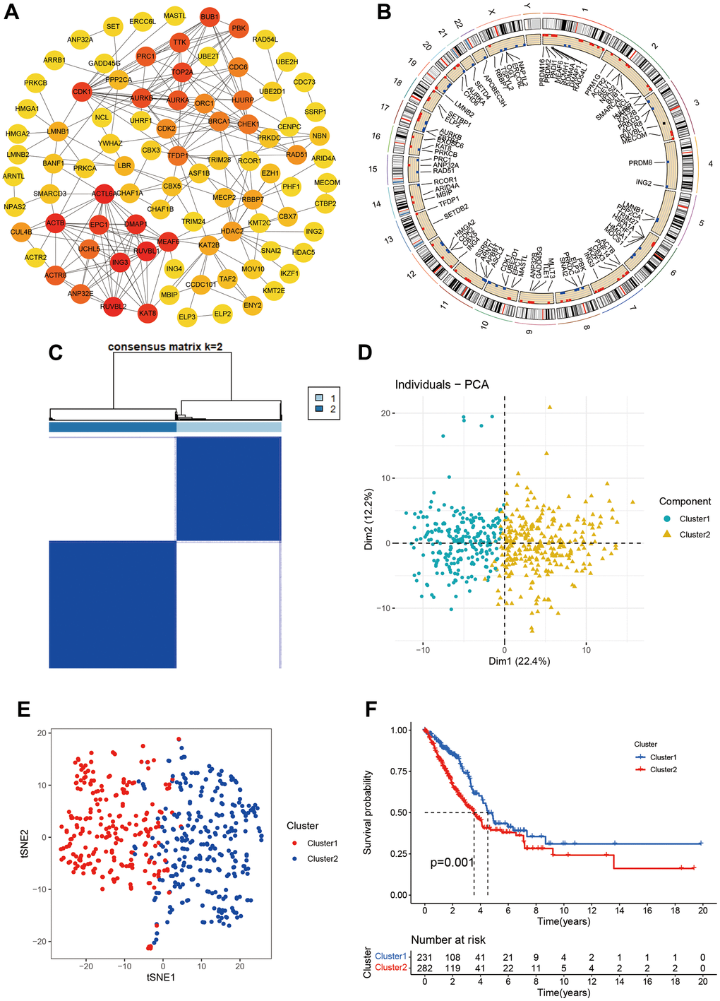 We obtained 870 CR genes from previous publications. After screening using Median absolute deviation (MAD) >0.5 and univariate cox regression (P<0.05), we identified 153 CR genes for molecular subtypes. We firstly built the PPI network for 153 CR genes and we found ACTL6A, RUVBL1, RUVBL2, ING3, ACTB, DMAP1, MEAF6, KAT8, EPC1, and CDK1 top 10 hub genes (Figure 1A). Then, we explored the location information and mutation frequency of these CR genes (Figure 1B). Using ConsensusClusterPlus package, we explored the molecular subtypes and found LUAD can be sharply and clearly divided into two clusters when the optimal k value is 2 (cluster 1 and cluster 2, Figure 1C). The PCA and t-distributed stochastic neighbor embedding method also showed a two-dimensional distribution (Figure 1D, 1E). Finally, we performed the Kaplan-Meier analysis and found the cluster 2 had poorer prognosis than cluster 1 (Figure 1F). These results suggested LUAD patients could be separated into two subtypes based on CR genes.