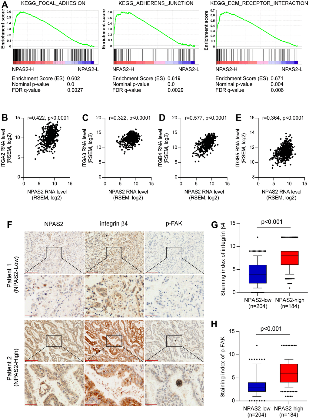 We further explored the association between NPAS2 and integrin beta4 and p-FAK that were key molecular of cell adhesion. The immunohistochemical tests indicated that the integrin beta 4 and p-FAK were significantly elevated in high-expressed NPAS2 group. We speculated that NPAS2 involved in the progression of LUAD via regulating cell adhesion.