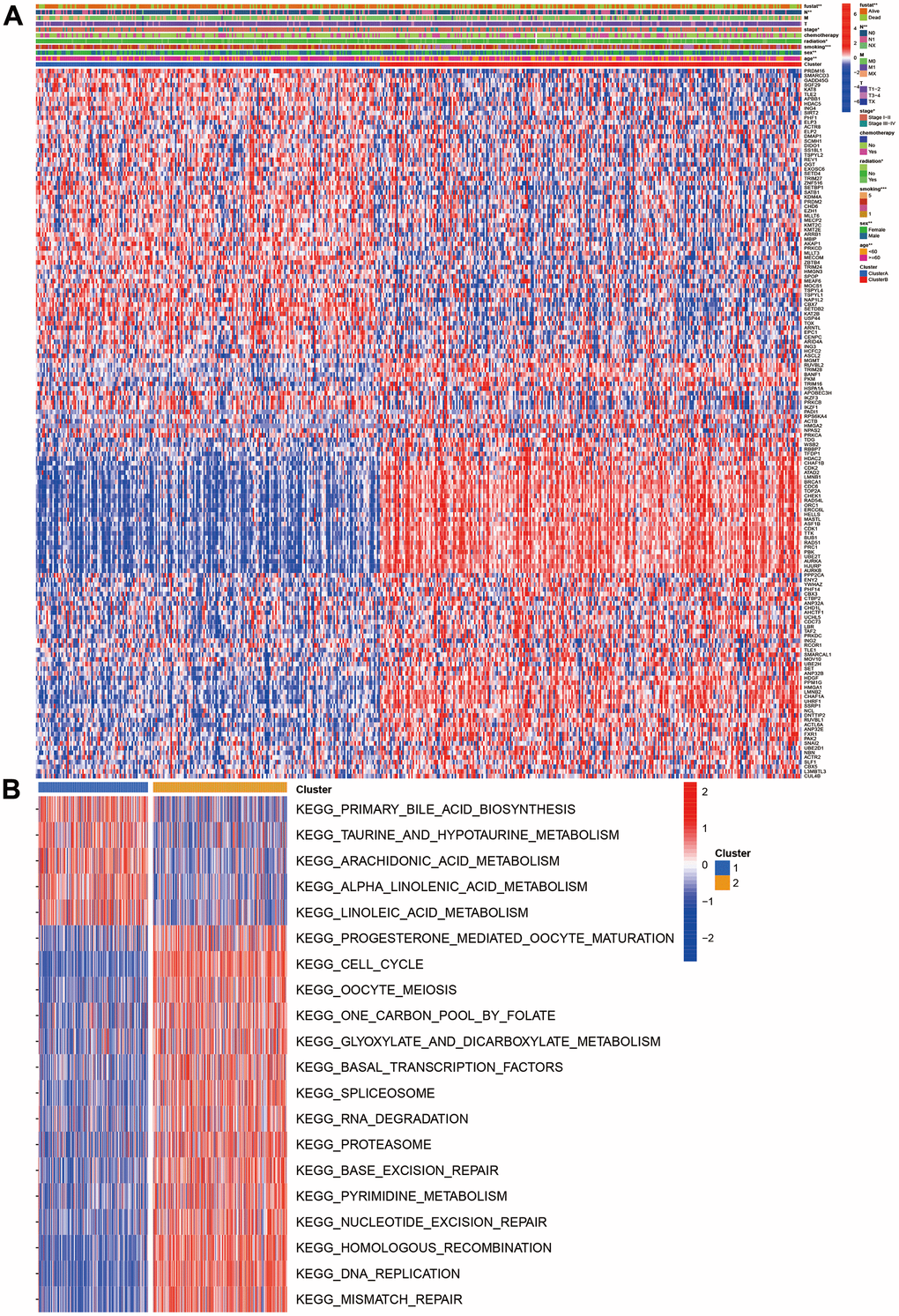 We also investigated the CR expression levels and compared the clinical characteristics of two clusters. Compared with cluster 1, the cluster 2 had higher ratios of male, smoking, no radiation, pathology stage, N stage, and poor prognosis. ATAD2, LMNB1, BRCA1, CDC6, TOP2A, CHEK1, RAD54L, ORC1, ERCC6L, MASTL, ASF1B, CDK1, TTK, BUB1, RAD51, PRC1, PBK, and UBE2T were markedly increased in the cluster 2 (Figure 2A). The GSVA results suggested that some pathways were positively enriched in the cluster 2, including cell cycle, oocyte meiosis, one carbon pool by folate, glyoxylate and dicarboxylate metabolism, RNA degradation, pyrimidine metabolism, homologous recombination, DNA replication, mismatch repair, and proteasome. The cluster 1 had higher primary bile acid biosynthesis, taurine and hypo taurine metabolism, arachidonic and linoleic acid metabolism (Figure 2B).