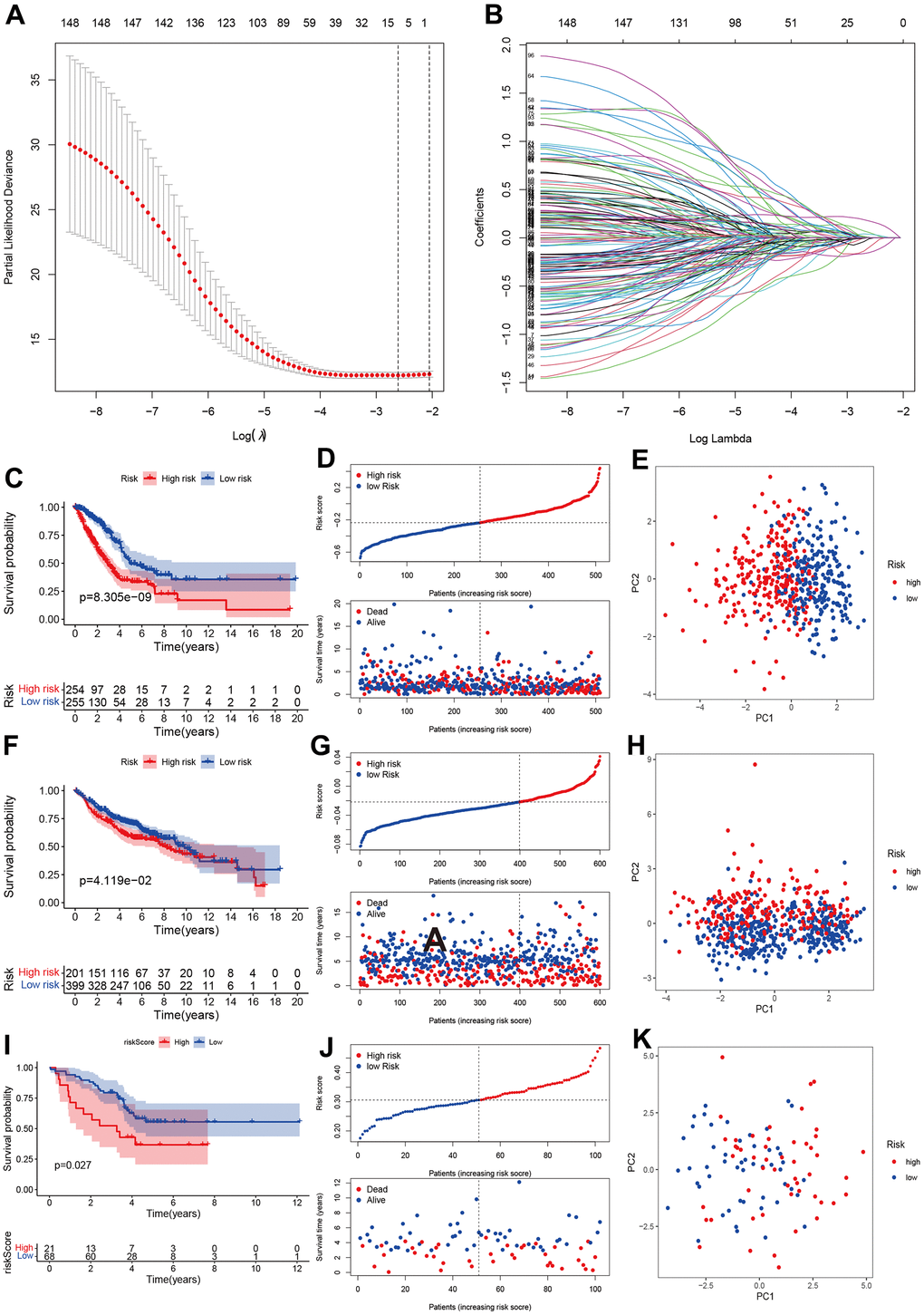 We developed a prognostic model for LUAD patients based on CR genes. We first carried out the LASSO regression and achieved the number of genes in the model. Eight genes entered final model (SETDB2, NPAS2, HMGA2, TLE1, HJURP, SNAI2, PHF1, PRKCD; Figure 3A, 3B). We then calculated the risk score of each sample using the regression coefficient multiplied by gene expression. All patients were divided into two groups (high- and low-risk groups) referring to the median of risk score. The Kaplan-Meier analysis indicated that high-risk group had poorer OS than the low-risk group (Figure 3C, 3D). PCA showed two obvious risk groups distributions (Figure 3E). We further validated the prognostic model in two datasets including GEO validation dataset (GSE31210, GSE37445, GSE50081, GSE19188, GSE30219) and ArrayExpress dataset (E-MTAB-923). Similarly, the prognosis of high-risk group was still poorer than the low-risk group (Figure 3F, 3G), and PCA showed two-dimensional data distributions (Figure 3H). Furthermore, another cohort data also confirmed our model (Figure 3I–3K).