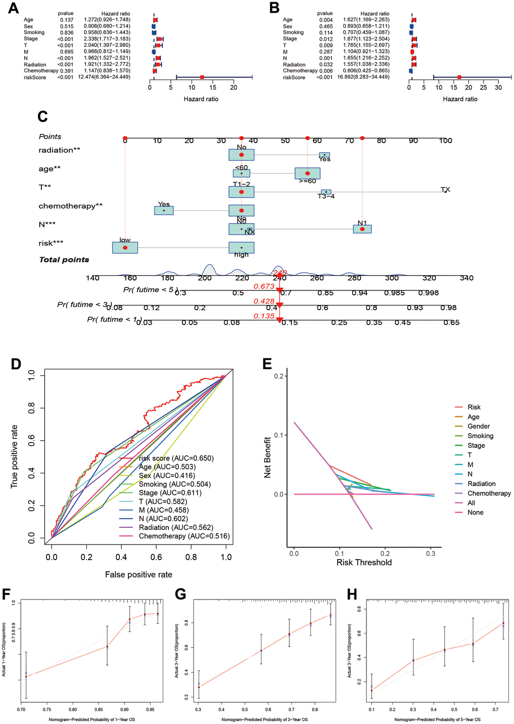 The univariate cox regression showed that risk score, pathology stage, T, N stage, and radiation were associated with prognosis (Figure 4A). The multivariate cox regression suggested that risk score can independently predict the prognosis in LUAD patients (HR=16.892, 95%CI:8.283-34.449, P<0.001; Figure 4B). Age, pathology Stage, T and N stage, radiation and chemotherapy were also associated with prognosis in LUAD.