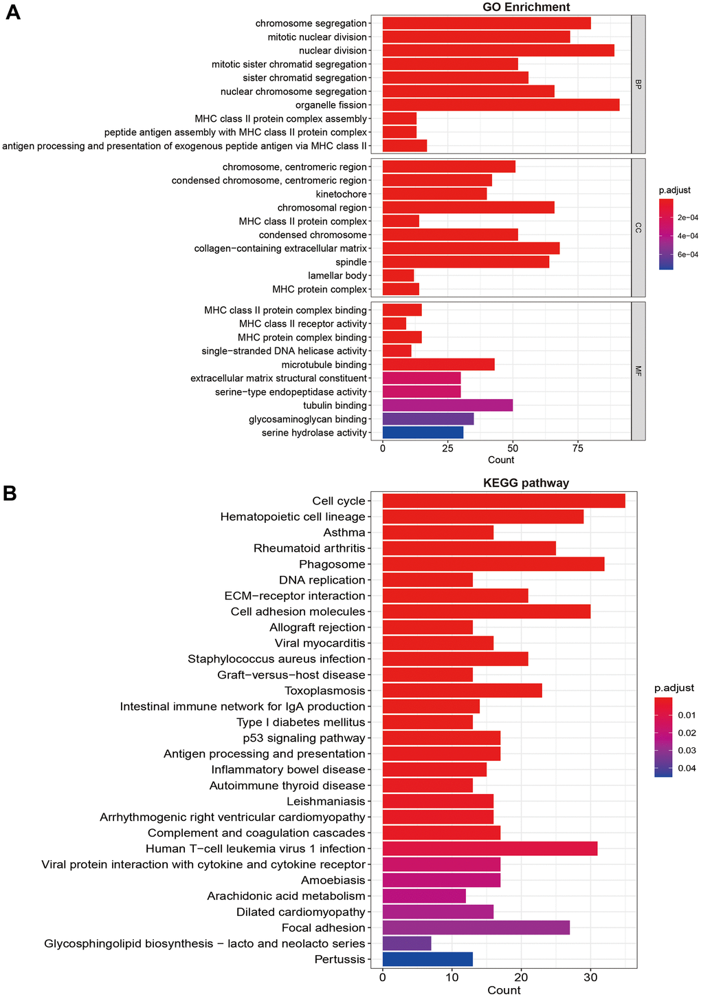 Through expression differences analysis, we obtained 371 differentially expression genes from the results. The GO function enrichment suggested that high-risk group was mainly enriched in chromosome segregation, nuclear division, MHC class II protein complex assembly, single-stranded DNA helicase activity (Figure 5A). The pathway analysis showed that high-risk group mainly enriched in cell cycle, DNA replication, ECM-receptor interaction, cell adhesion molecules, p53 signaling pathway, and focal adhesion (Figure 5B).