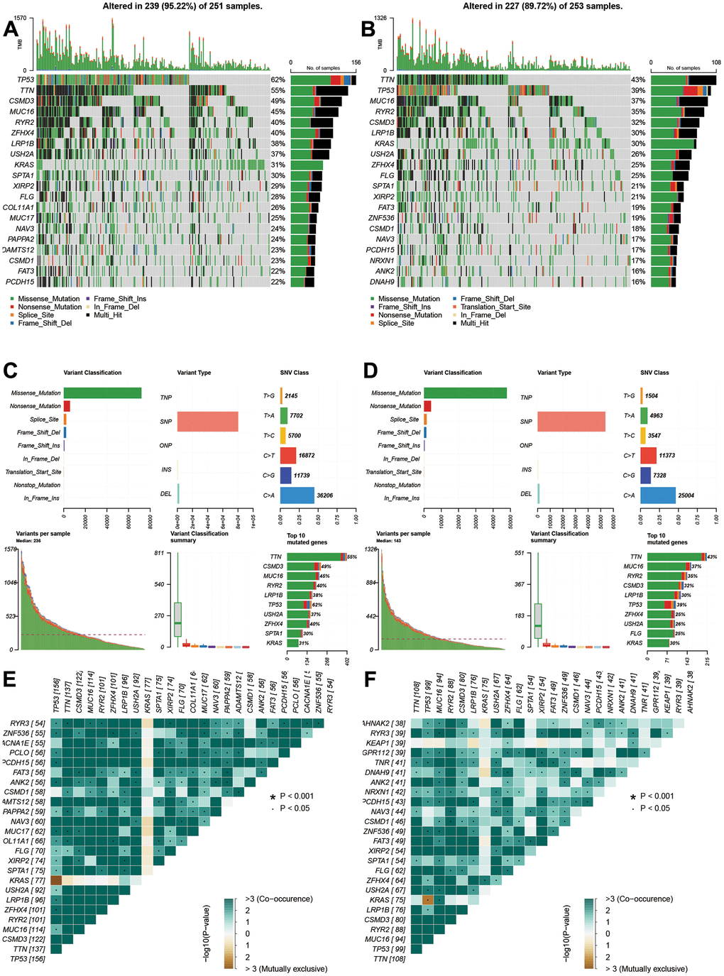 The gene alterations were also analyzed. The high-risk group had higher alteration levels than low-risk groups. The top 10 gene alterations were TP53, CSMD3, TTN, ZFHX4, USH2A, MUC16, RYR2, KRAS, LRP1B, and SPTA1 for high-risk group (Figure 6A), and the top 10 genes were TTN, TP53, MUC16, RYR2, CSMD3, LRP1B, KRAS, USH2A, ZFHX4, and FLG for low-risk group (Figure 6B). No significant differences were observed in variant classification and variant type, and SNV class for two risk group (Figure 6C, 6D). For high-frequency gene alteration, the co-occurrence showed similar trends between high-risk and low-risk groups. Top altered genes were highly correlated (Figure 6E, 6F) for two risk groups. There are still some differences for two groups such as MUC16, KRAS, LRP1B, USH2A, and ZFHX4.