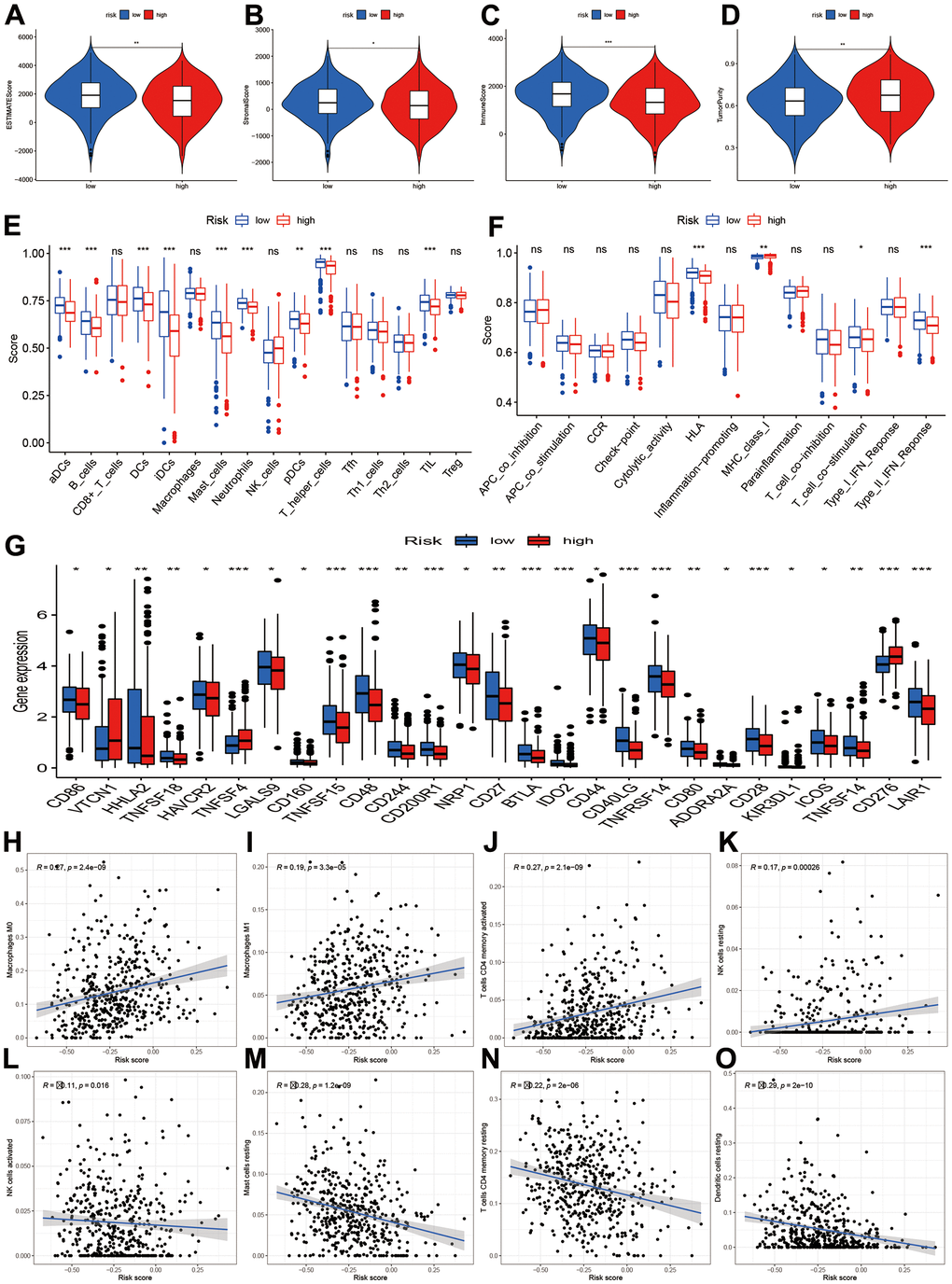 The tumor microenvironment and immune infiltration levels were also evaluated. The results showed the low-risk had higher ESTIMATE, stromal and immune score (Figure 7A–7C, P<0.05). However, the tumor purity increased in the low-risk group (Figure 7D, P<0.01). The infiltrations levels of high-risk group were lower than low-risk group, including aDCs, B cells, DCs, iDCs, mast cells, neutrophils, NK cells, pDCs, T helper cells, TIL, HLA, and type II IFN response (Figure 7E). However, the MHC class I was higher in the high-risk groups. We further compared the immune-checked point genes. The VTCN1, TNFSF4, CD276 genes presented elevated levels in the high-risk groups (Figure 7G). Furthermore, macrophages M0, M1, T cells CD4 memory activated, and NK cells resting were positively related to risk score (Figure 7H–7K), while NK cells activated, mast cell resting, T cells CD4 memory resting, and dendritic cells resting were negatively related to risk score (Figure 7L–7O).
