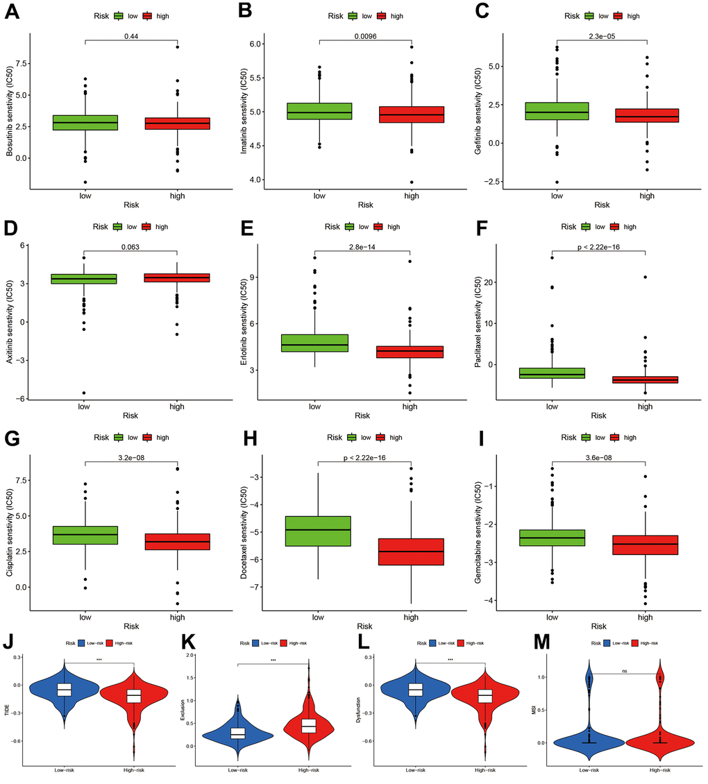 To explore the potential treatment molecular, we compared the IC50 of two groups in some compounds. The results suggested that Imatinib and Gefitinib may be sensitivity in high-risk group (Figure 8A–8C). Erlotinib, Paclitaxel, Cisplatin, Docetaxel, and Gemcitabine may show chemotherapy resistance for high-risk group (Figure 8D–8I).
