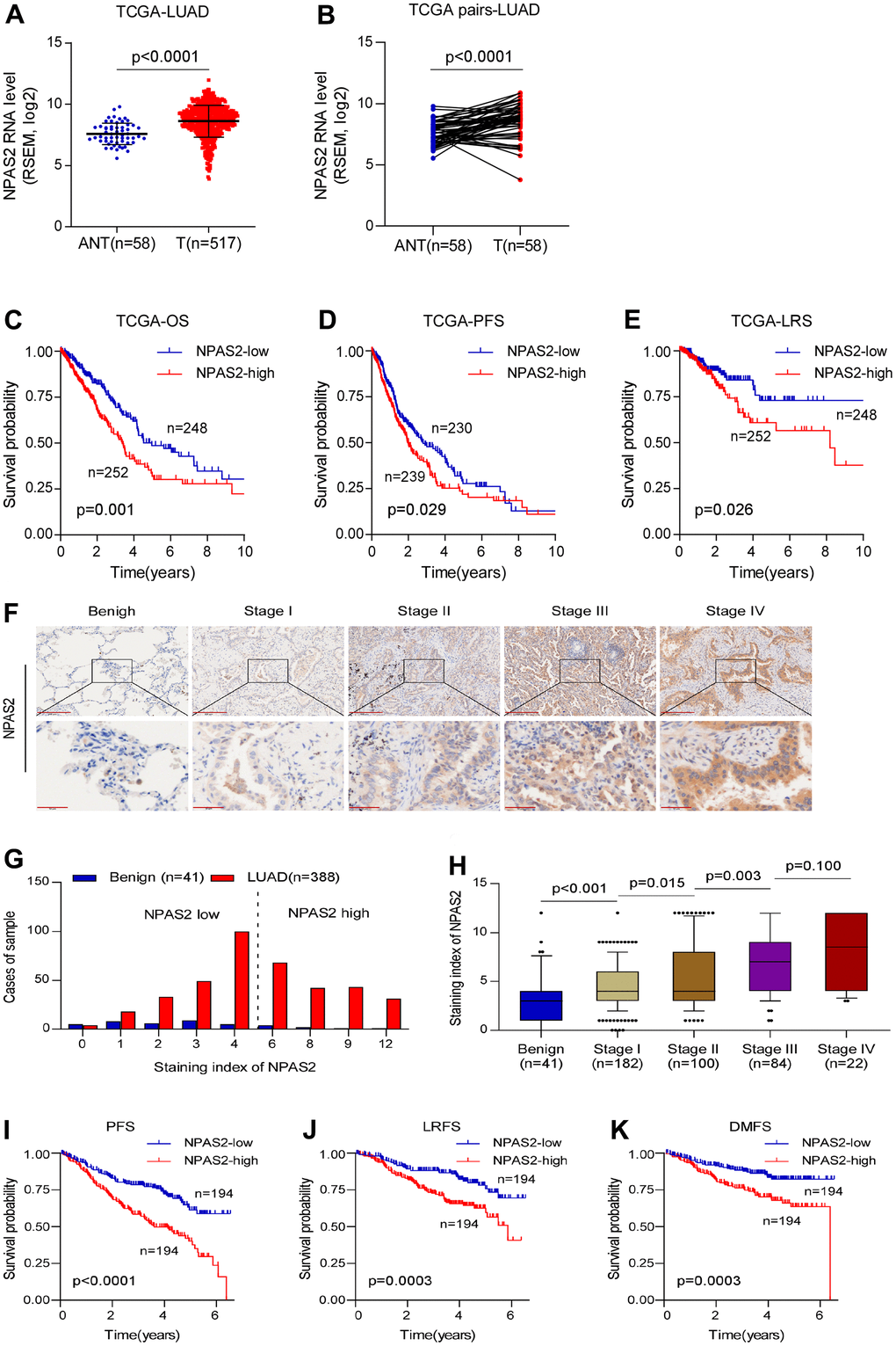 The reason we chose NPAS2 for validation is that NPAS2 was only significantly elevated in tumor but associated with poor prognosis. We collected 388 samples of LUAD patients to validate our findings. The clinical information of 388 patients and normal tissues were presented in Supplementary Tables 1, 2. We firstly analyzed the NPAS2 expression in TCGA. We found significance differences between benign and tumor samples (Figure 9A, 9B). The Kaplan-Meier curve indicated that high-expressed NPAS2 was associated with poor OS, PFS and LRS (Figure 9C–9E). We next detected the expression of NPAS2 in 388 LUAD samples using immunohistochemical method. The NPAS2 expressed increased with elevated stage (Figure 9F–9H and Supplementary Table 3). The univariate and multivariate cox regression also indicated that high-expressed NPAS2 was an independent prognosis factor (Supplementary Tables 4, 5). We further confirmed that high-expressed NPAS2 was related to poor PFS, LRFS and DMFS in LUAD (Figure 9I–9K).
